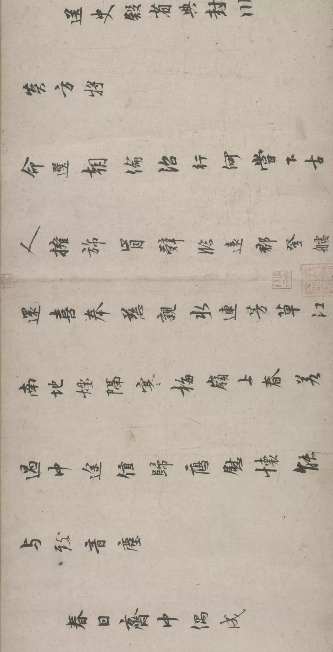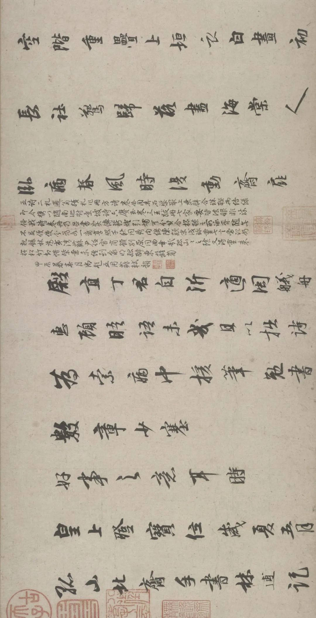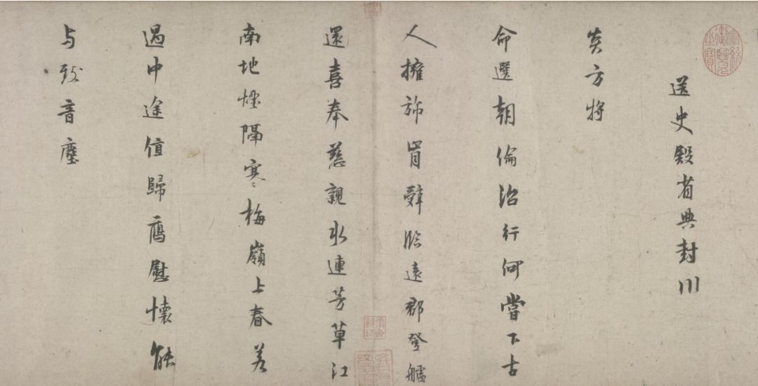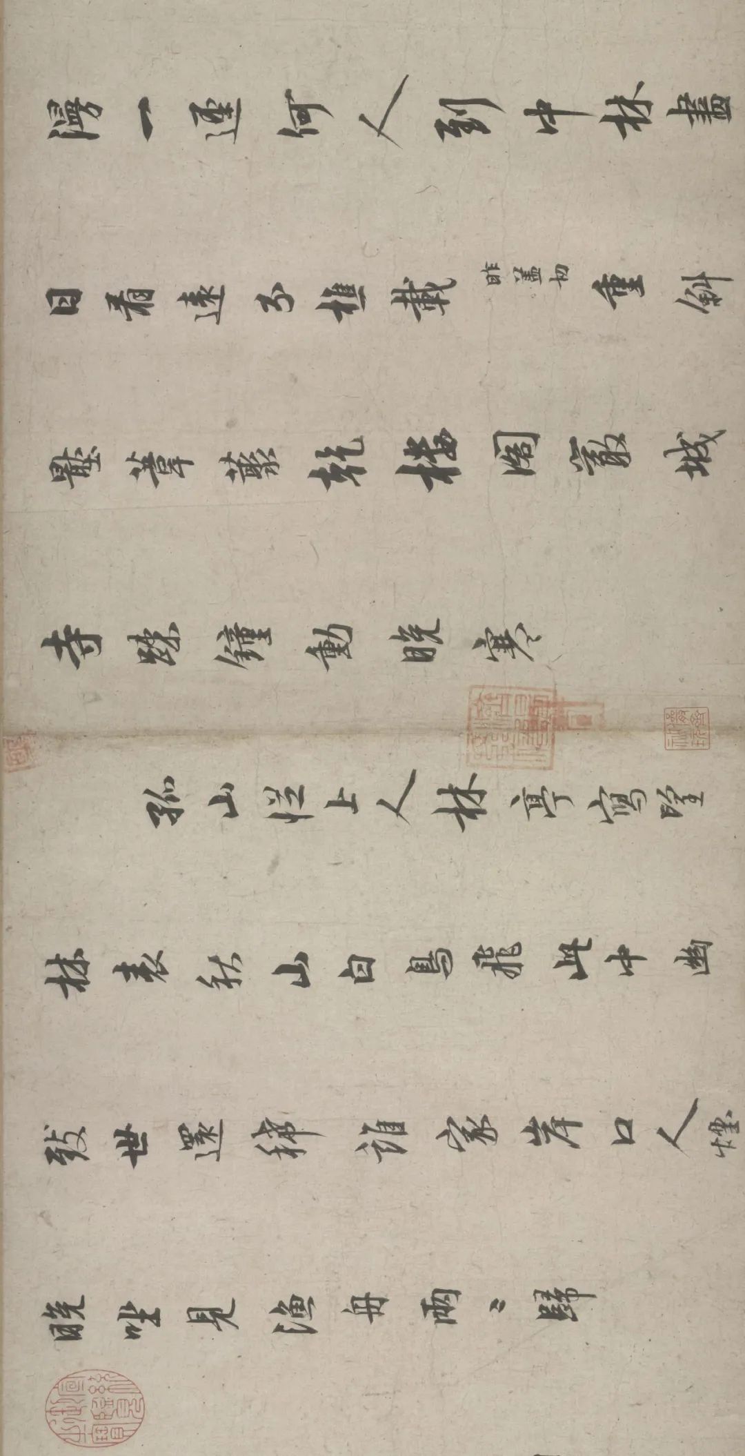 五诗二札逋翁迹,札作册方诗卷曲。同弆石渠最上乘。璧合珠聨两结绿,即今携以随南巡。对景坡诗六赓玉,卷三王(世贞世懋绪)。跋册七家(谢升孙沈周)。(陈颀吴宽东阳张渊程敏政《石渠宝笈》旧蔵林逋诗卷手书七言近体诗五首苏轼长歌极为推许后有王世贞等三跋,又裘曰:修得林逋二札装为一册呈进有谢升孙等诗跋诸人皆元明以来赏鉴家非漫为推许者,逋人品高卓遗墨流传宜加宝护况此卷与册壁合珠聨不期,而会尤为艺林嘉话余自丁丑南巡题句至今甲辰复携以随跸凡六叠苏轼韵中间缕陈巅末以识珍重爱慕盖不啻三致意云)。要皆法眼非流俗,我诗卷册乃并书,如火传薪灯引烛。其分其合总听之,所咏胥随无不足。便使分为各一脔,享照千秋同鼎肉。缕陈颠末识珍重,七言当记仍亲录。林为夷清苏尹任,宫商虽别原同曲。幸哉孤山山之阴,又得重来抚松竹。却惜柴桑未经到,泉明孤醉东篱菊。甲辰暮春月御题,五用苏轼韵。