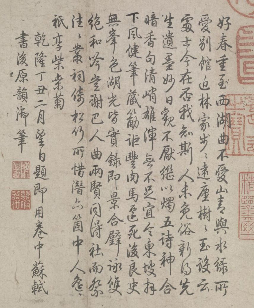 好春重至西湖曲,不爱山靑与水绿,所爱别馆近林家,步步远尘树树玉,设云处士今在否,我知斯人未免俗,新得先生遗墨妙,日观不厌继以烛,五诗神合暗香句,清峭雄浑无不足,宜令东坡拜下风,健笔藏筋讵丰肉,马迁死后良史无,峰色湖光皆实录,即景合璧咏双绝,和吟岂谢巴人曲,两贤同得社而祭,往往丛祠倚松竹,所惜潜亦个中人,遥遥祗享柴桑菊。乾隆丁丑二月望日题,即用卷中苏轼书后原韵御笔。