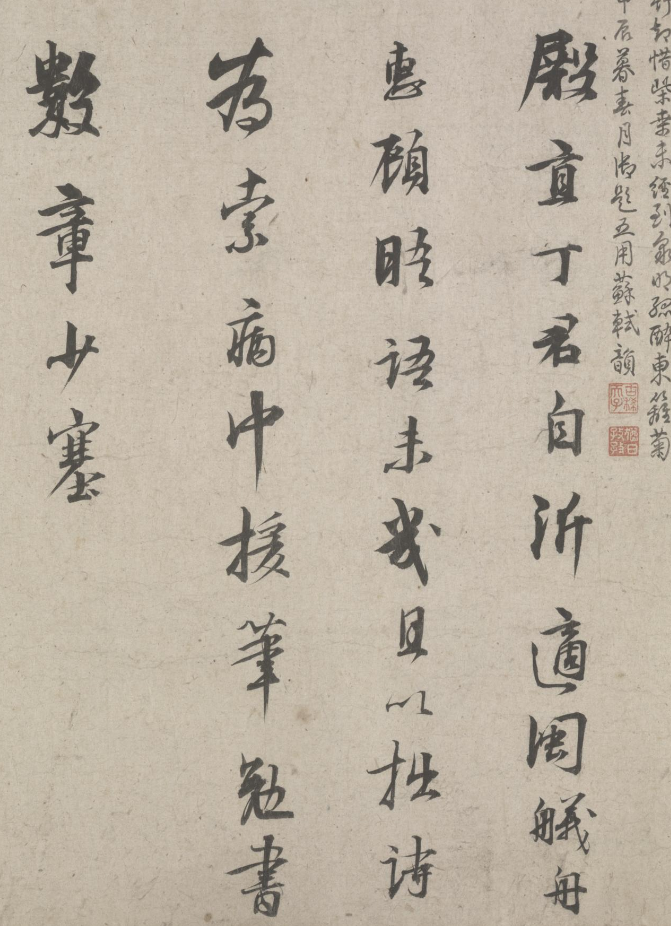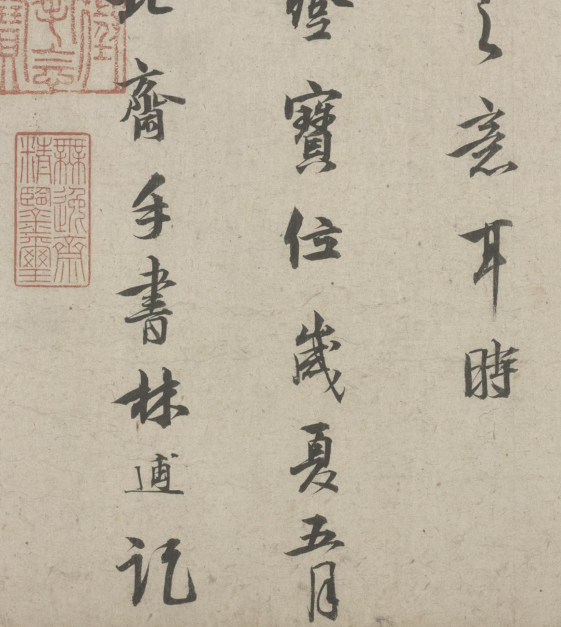 据诗后林逋自识:“時皇上登寶位歲夏五月”,可知此作品写于仁宗天圣元年癸亥(1023年),林逋时年57岁,其 书体瘦劲,秀逸,笔法厚重,风致绰约 ,与时人李建中风骨俊整的书风极为接近。再后又有苏轼书七言古诗一首,无年款,据徐邦达先生考证可能是元祐四、五年间苏轼(时年约54岁)第二次到杭州作刺史时所书。 此书藏锋敛锷,姿媚可爱,是罕见的苏轼传世佳作之一 。这两段名人书法相映生辉,珠联璧合,实为难得的珍宝。