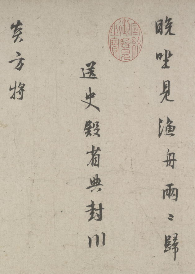 空階重疊上垣衣,白晝初長社燕歸。落盡海棠人臥病,春風時澓動齋扉。殿直丁君自沂適閩,艤舟惠顧晤語。未幾,且以拙詩爲索,病中援筆勉書數章,少塞好事之意耳。時皇上登寶位歲夏五月,孤山北齋手書,林逋記。