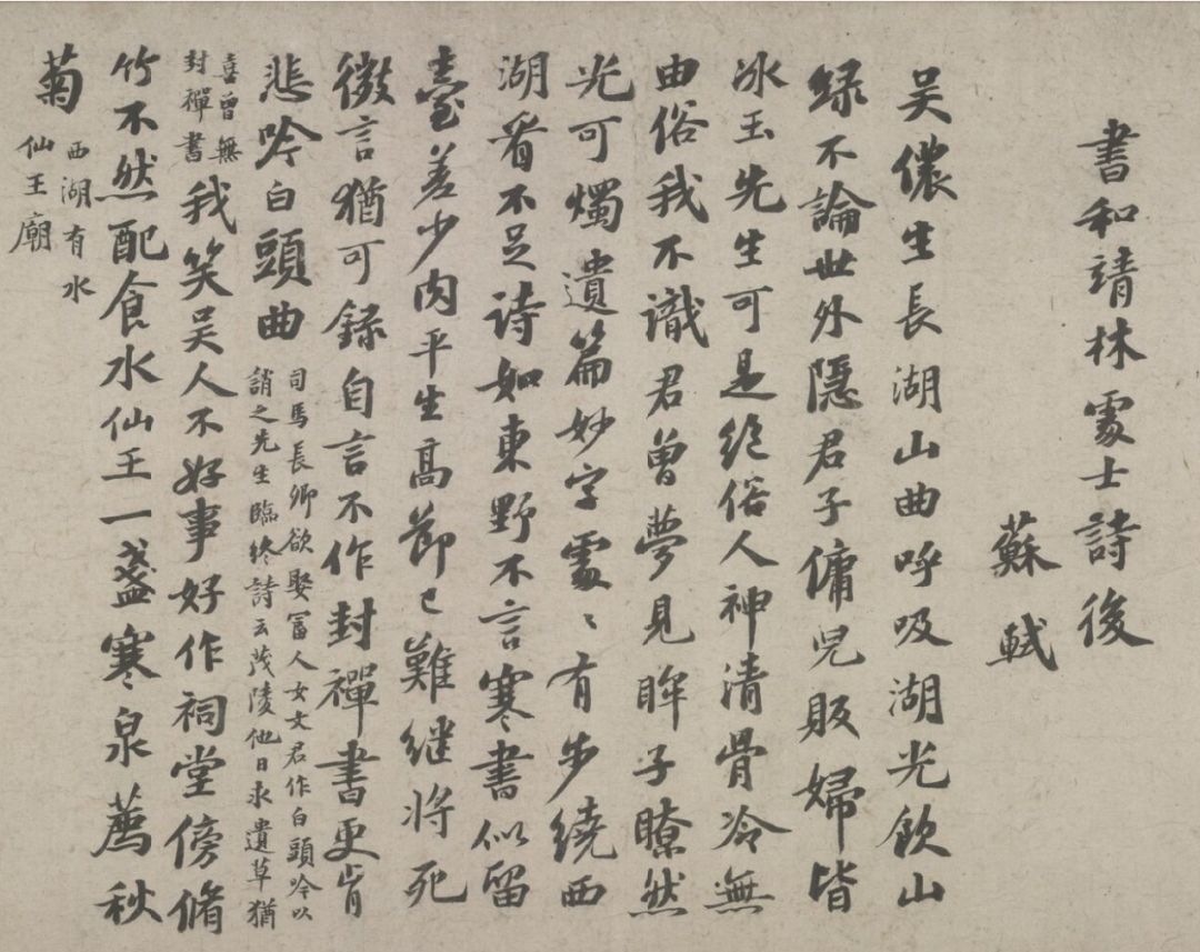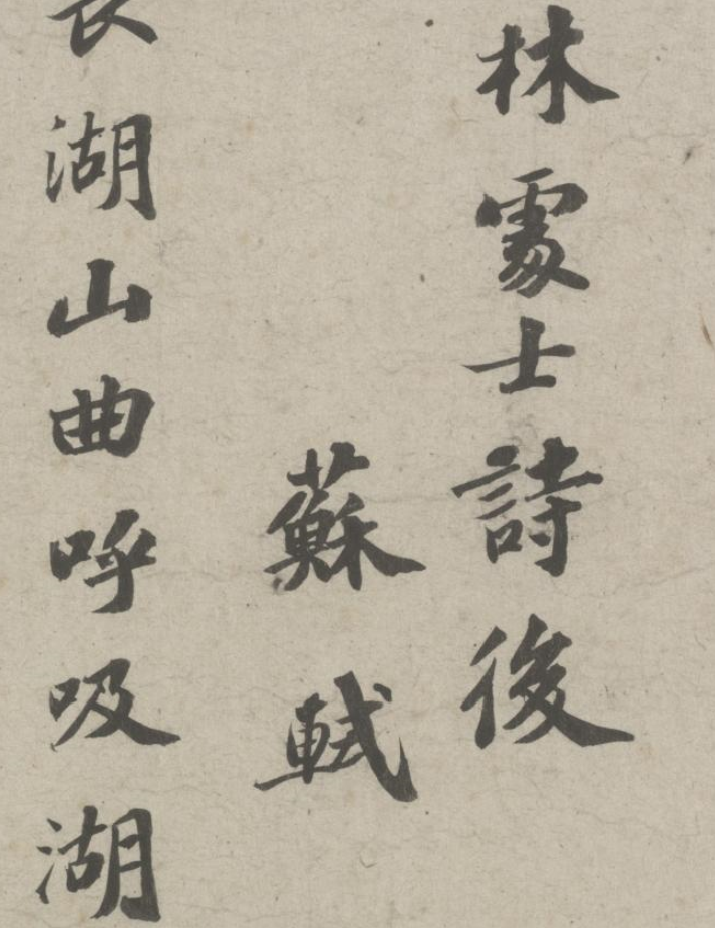 书和靖林处士诗后,苏轼。吴侬生长湖山曲,呼吸湖光饮山渌。不论世外隐君子,佣儿贩妇皆冰玉。先生可是绝俗人,神清骨冷无由俗。我不识君曾梦见,瞳子了然光可烛。遗篇妙字处处有,歩绕西湖看不足。诗如东野不言寒,书似西台差少肉。平生高节巳难继,将死微言犹可录。自言不作封禅书,更肯悲吟白头曲。我笑吴人不好事,好作祠堂傍修竹。不然配食水仙王,一盏寒泉荐秋菊。
