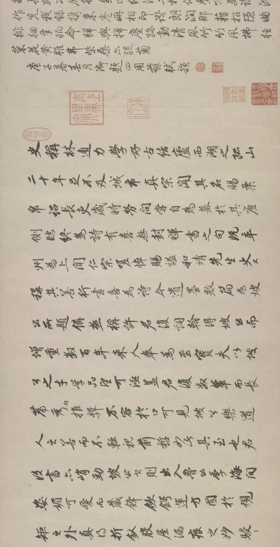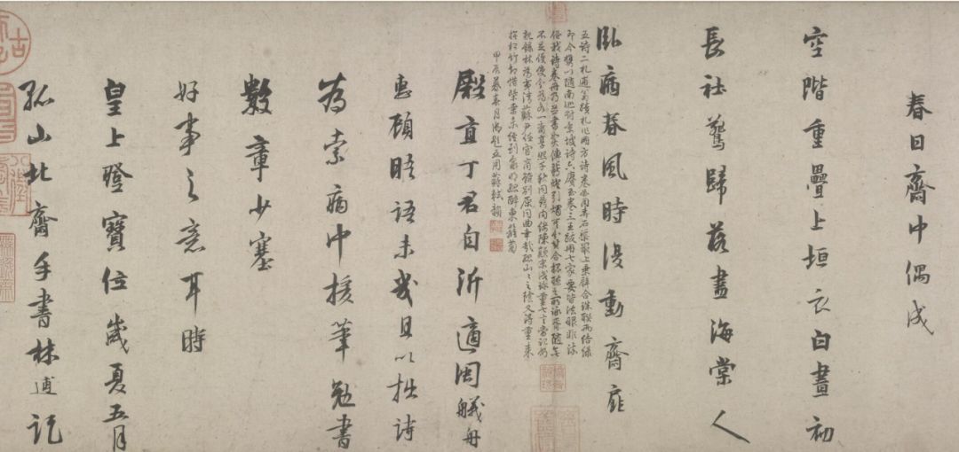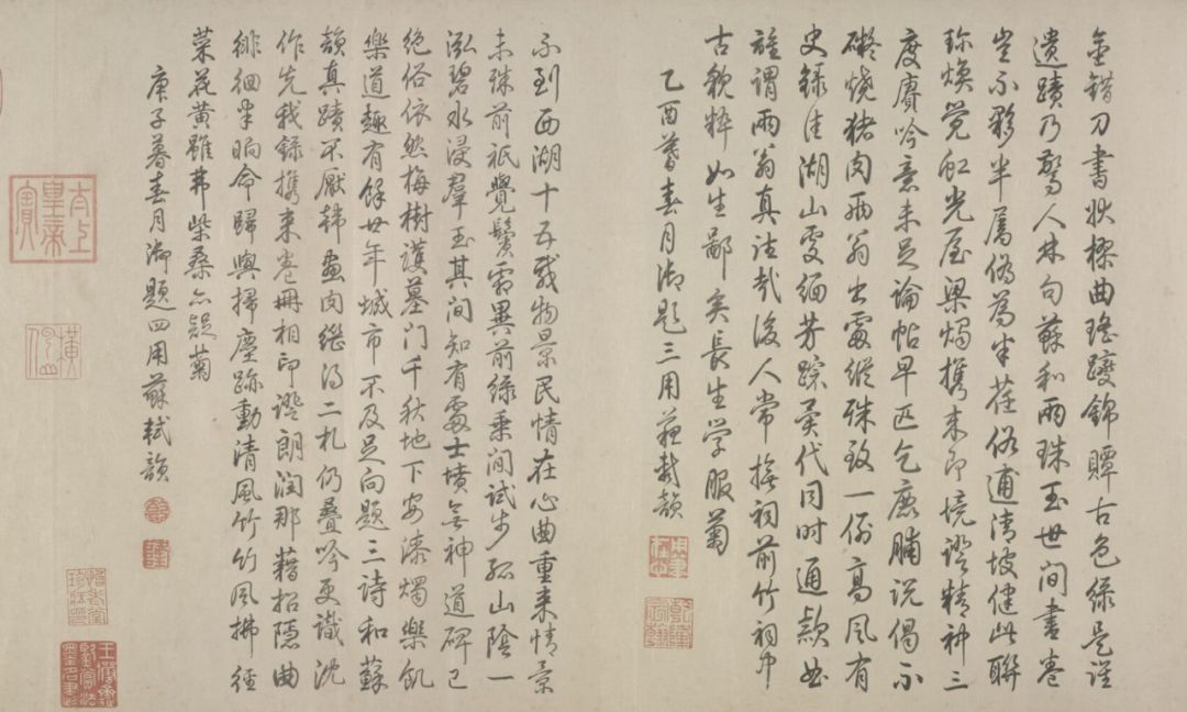 后纸有乾隆皇帝用苏轼原韵四次御题七言诗及题记一段,又有明王世贞、王世懋,清王鸿绪、董诰四家题跋。