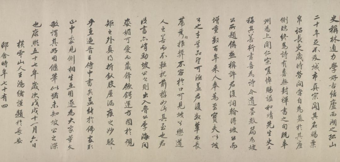 史称林逋力学好古,结庐西湖之孤山,二十年足不及城市。真宗闻其名,赐粟帛,诏长吏岁时劳问。尝自为墓于其庐侧。临终为诗,有喜无《封禅书》之句。既卒,州为上闻,仁宗嗟悼,赐谥“和靖先生”。史又称其善行书,喜为诗。今遗墨数篇为坡公所题。备极称许君复词翰,得坡公而增重。数百年来,人奉为至宝。夫以坡公之才学品望,可涵盖君复数辈而长篇秀句,推荐容于口。可见坡公乐道人之善,而不轻视前哲,如此其至也。君复书六峭劲,坡公书则出入鲁公季海间。姿媚可爱,而藏锋敛锷,运方圆于规矩之外,真乃折剑股屋漏痕之妙。骎骎乎直逼晋王侍中书矣。盖能于偏处耶,正中出见侧相生互用,遂为大家董文敏谓其好用偃笔,似犹未知,坡公之深也。康熙五十七年岁次戊戌十一月六日,横零山人王鸿绪谨题于长安邸舍,时年七十有四。