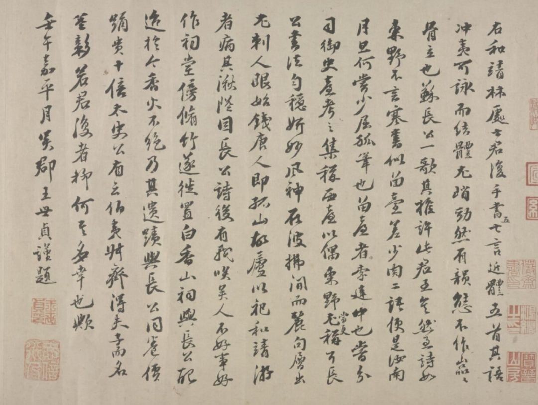 右和靖林处士君复手书七言近体,五首其语冲夷可咏。而结体尤峭劲,然有韵态不作,嵓嵓骨立也。苏长公一歌,其推许此君至矣,然至诗如东野,不言寒书似留。台差少肉二语,便是汝南月旦何甞少屈狐笔也。留台者李建中也甞分司御史台考之集,称西台以偶东野当更称耳。长公书法匀稳妍妙风神在披拂间,而丽句层出,尤刺人眼。始钱塘人即孤山,故庐以祀和靖,游者病其湫隘因长公诗后有我笑。吴人不好事,好作祠堂傍修竹,遂徙置白香山祠,与长公配故迨于今,香火不绝,乃其遗迹与长公同巻价,踊贵十倍。太史公有云:伯夷叔齐得夫子而名益彰若,君复者抑何其多幸也欤。壬午嘉平月吴郡王世贞谨题。