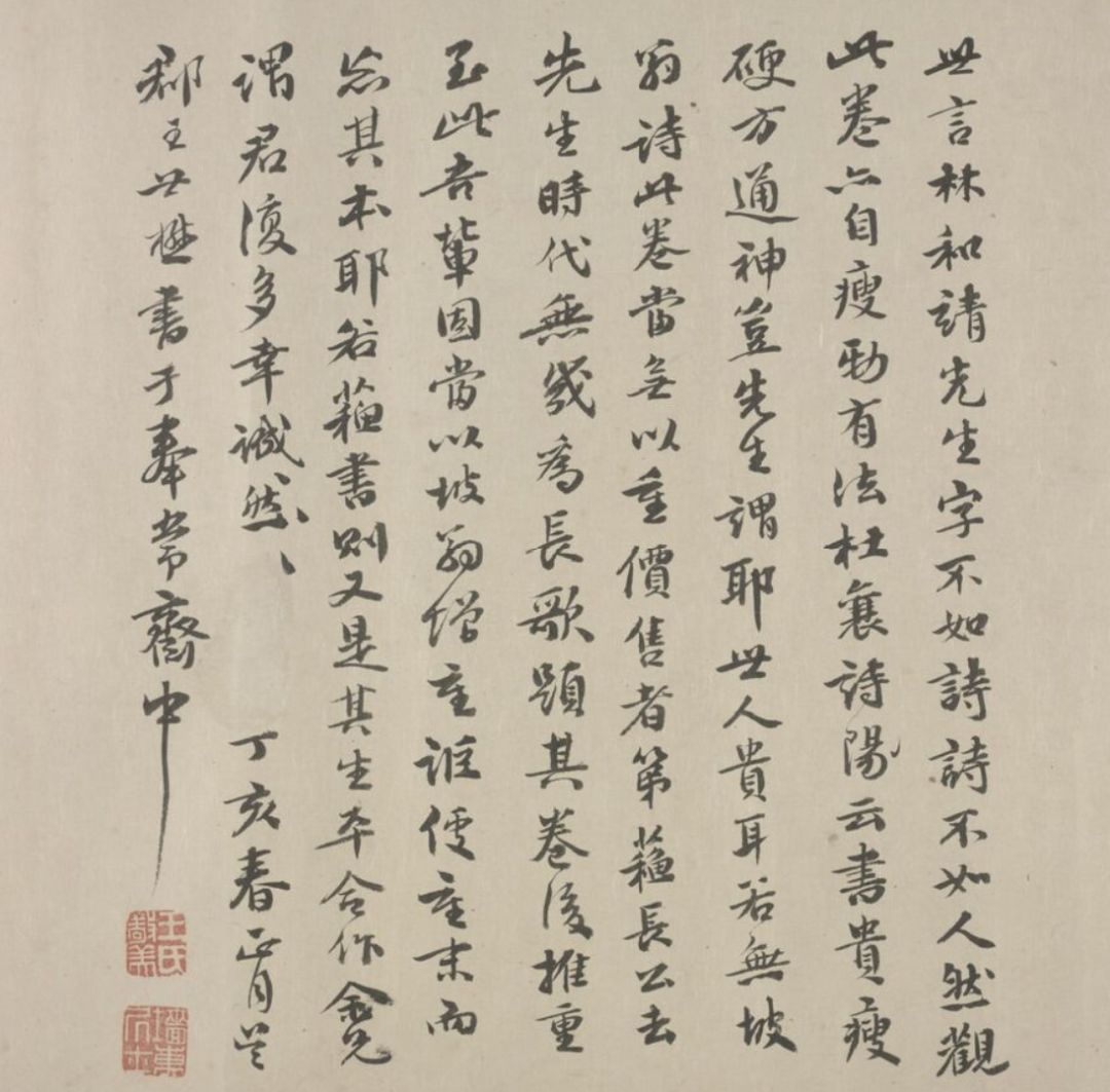 世言林和靖先生字不如诗,诗不如人,然观此卷,X自瘦劲有法。杜襄诗阳云:书贵瘦劲硬方通神。岂先生谓耶。世人贵耳若无坡翁诗,此卷当无以重价售,者第,苏长公去,先生时代无几为长歌题其卷后推重至此。吾辈固当以坡翁增重讵X重末而先其本耶。若苏书则又是其生平合作余兄,谓君复多幸诚然。丁亥春正月吴郡王世懋书于奉常斋中。