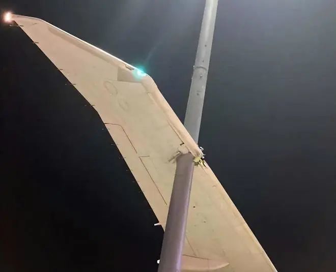 受损的飞机机翼,路灯依然亮着