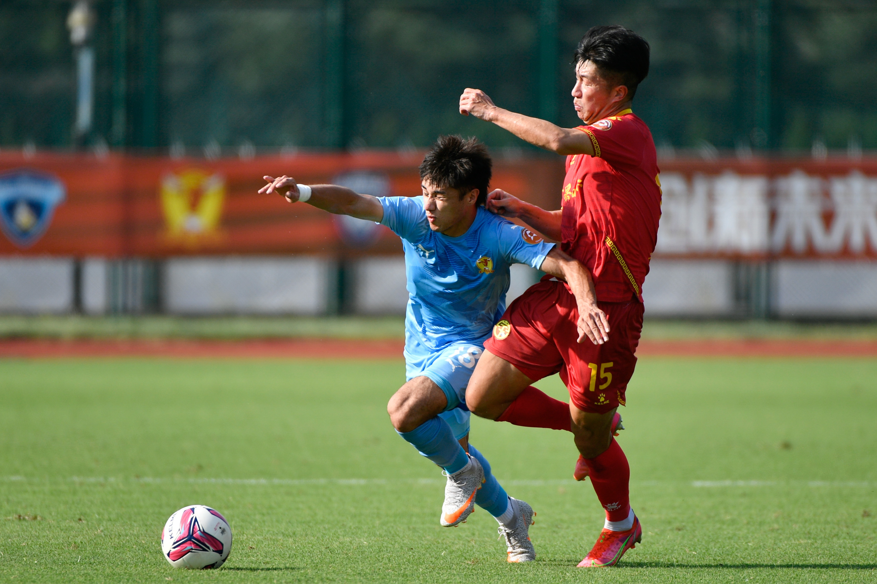 8月9日,广西平果哈嘹队球员耿泰立(左)在比赛中射门。新华社发(史康摄)