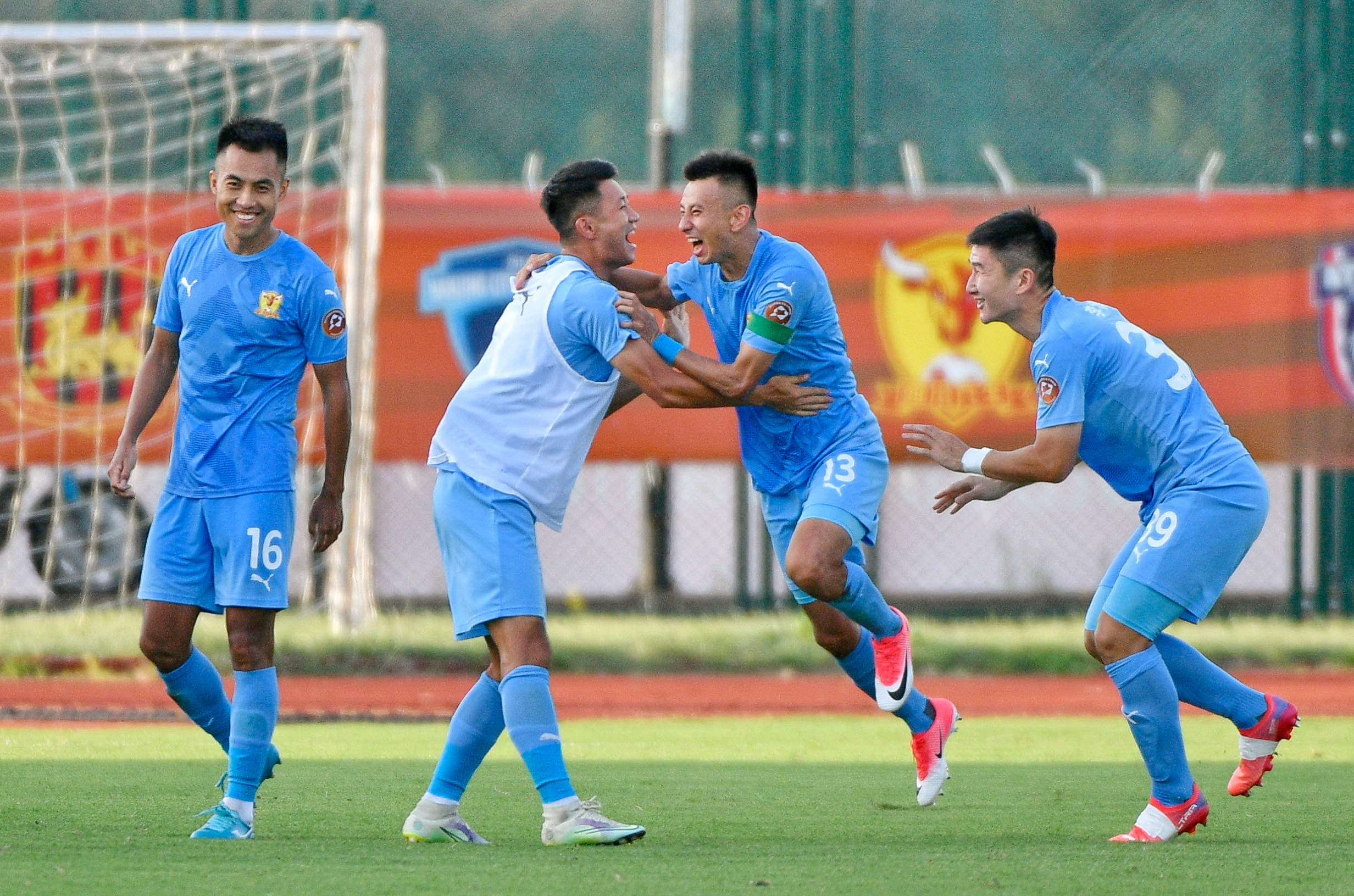 8月9日,四川九牛队球员马晓磊(右二)射门得分后与队友庆祝。新华社发(史康摄)