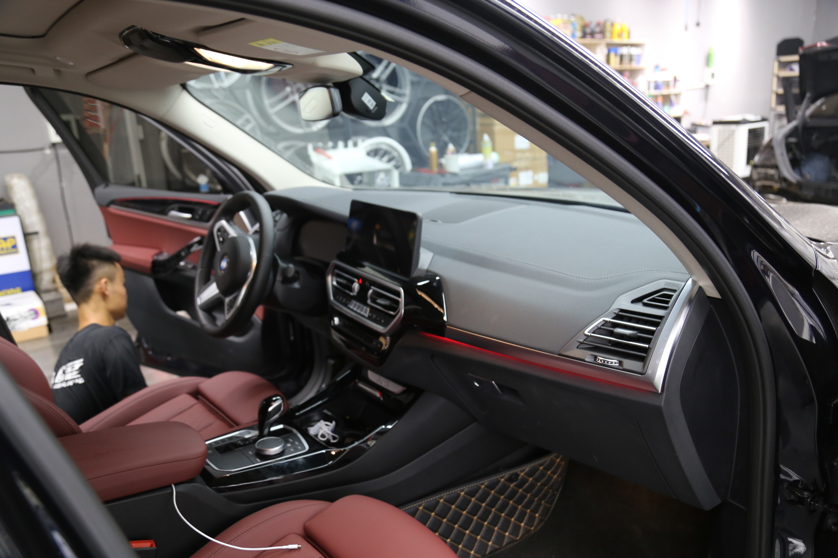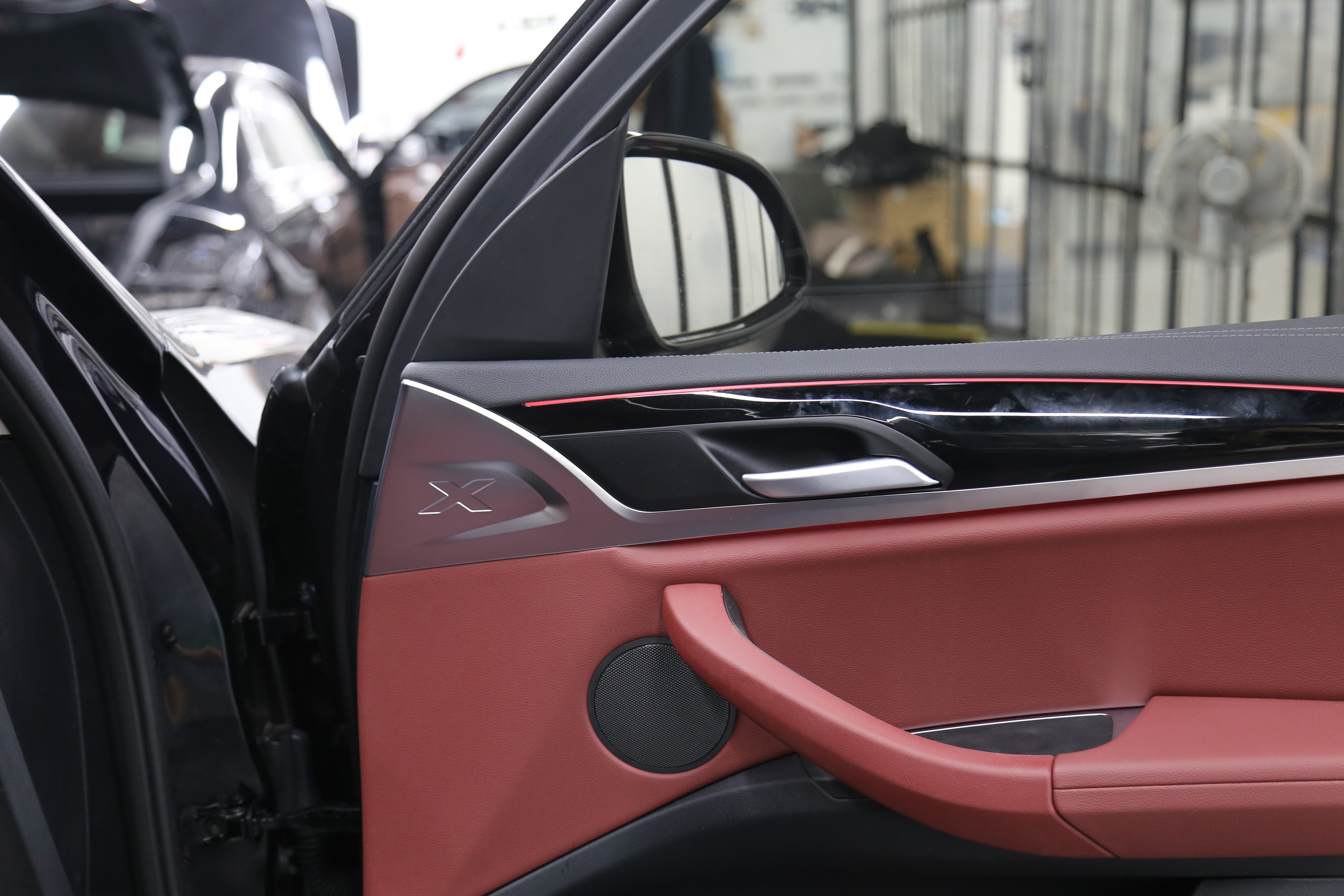 这台宝马X3的发光套件是两个前门A柱各一个,前门板上各一个,后门板各两个。