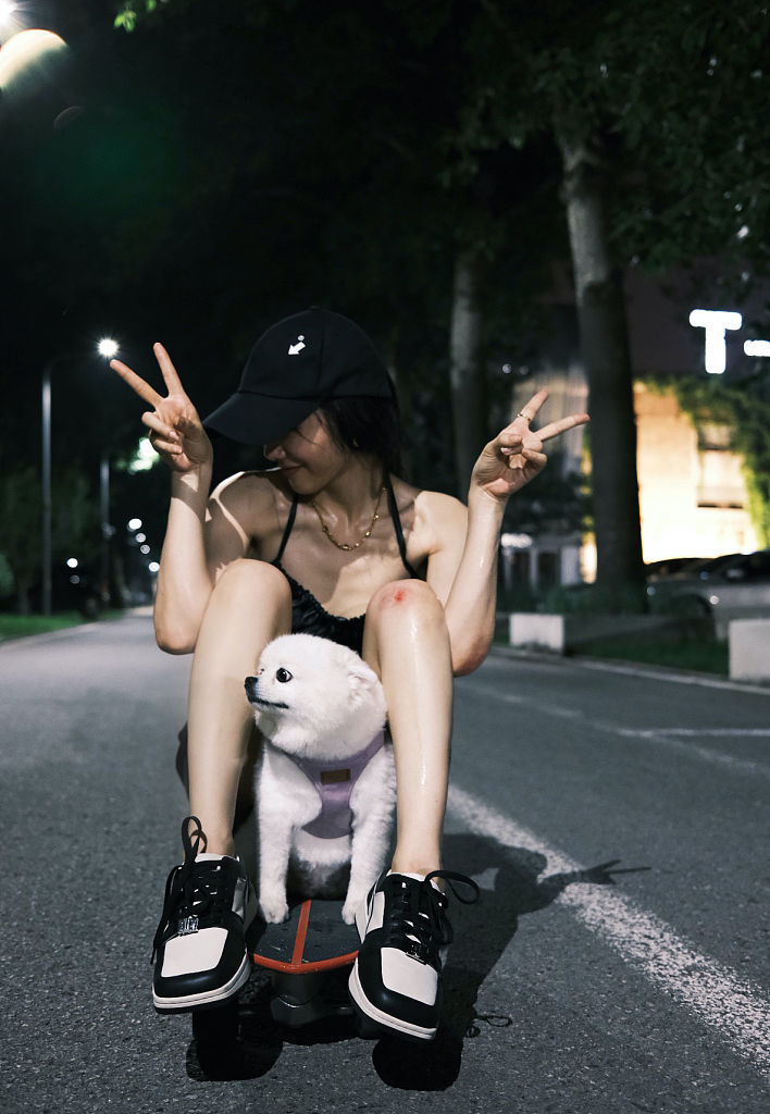 2022年8月9日,蔡文静发布一组夜间外出玩滑板的照片,她膝盖受伤有明显淤青,不过还是双手比V搞怪十足。