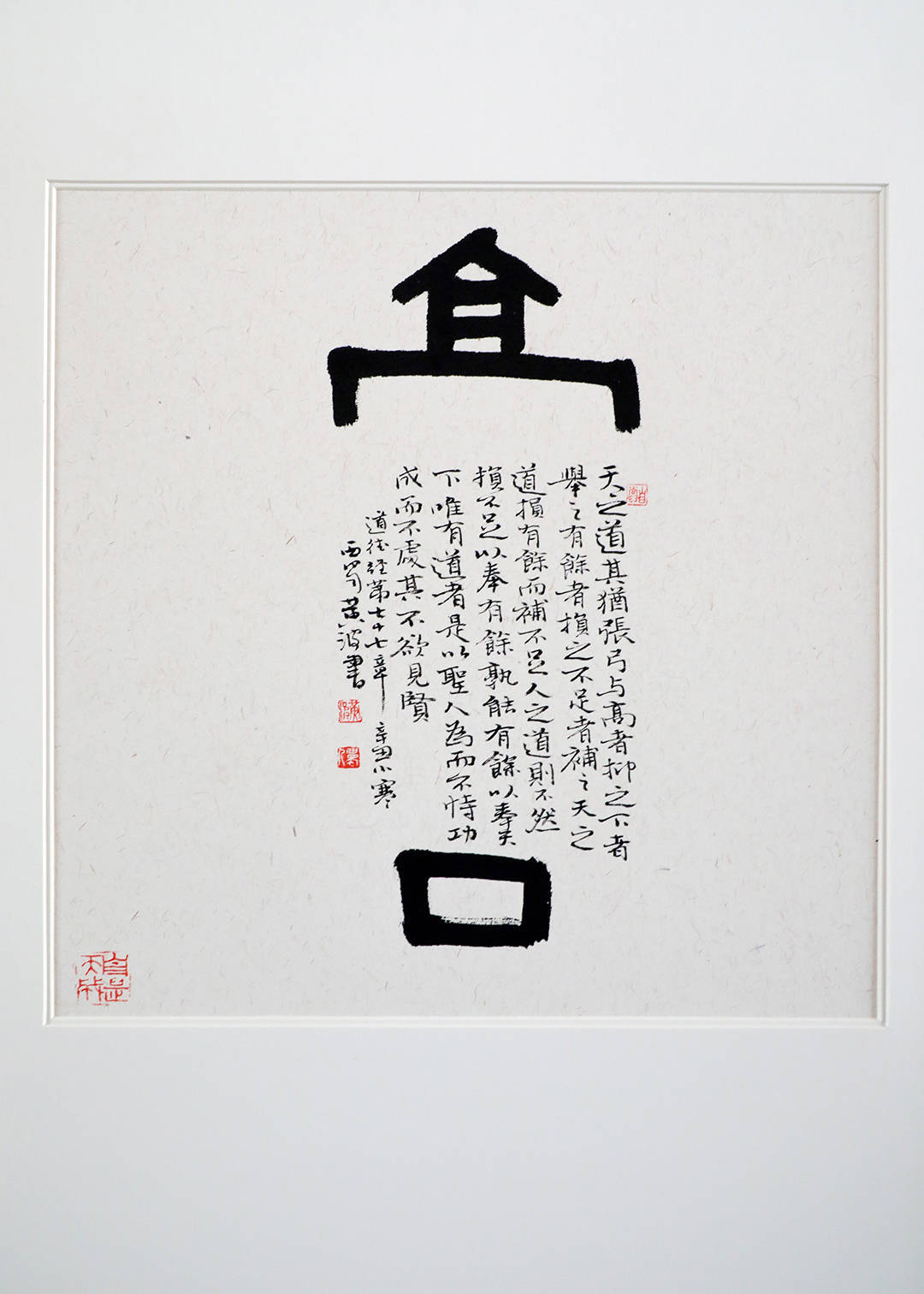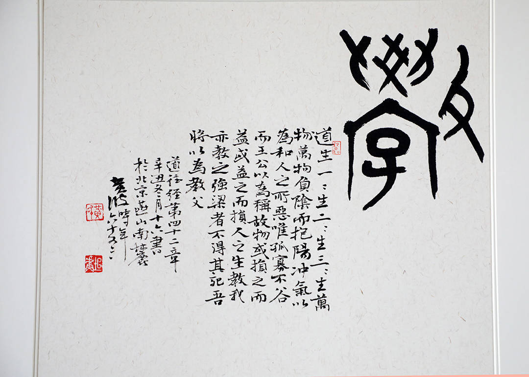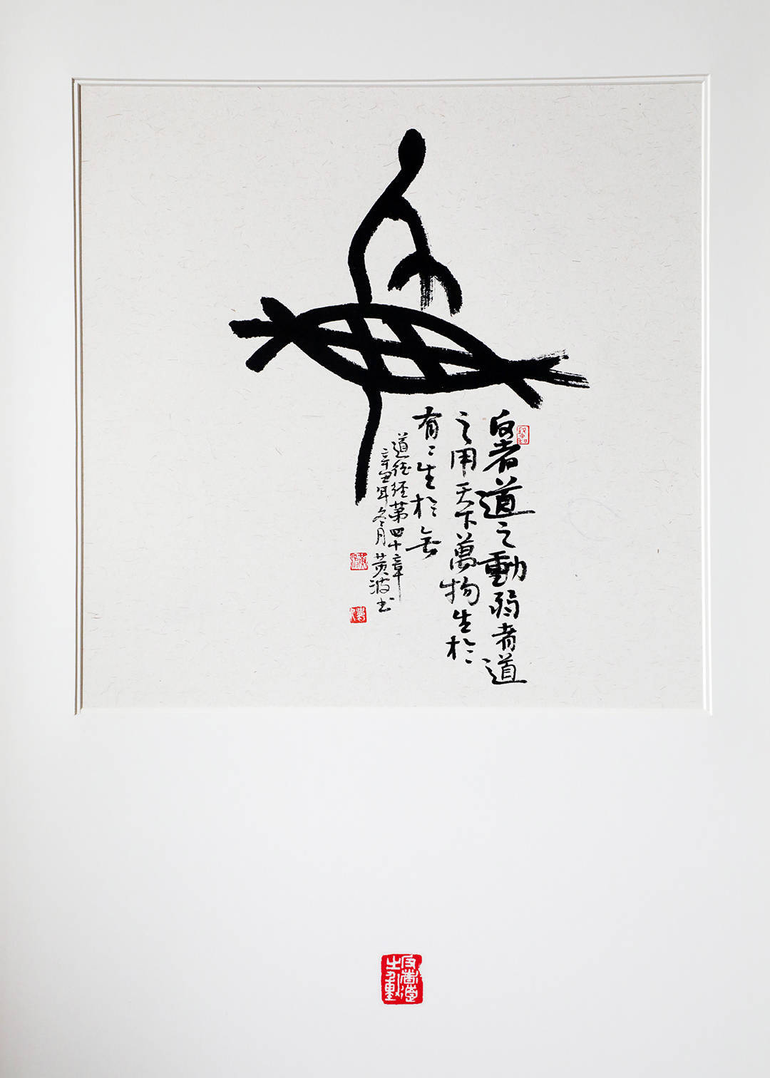 此次在古楼观景区百经之首展厅,共计展出黄波先生80余幅佳作,每幅作品以字源解说《老子》(《道德经》),从每章中提炼一个关键字创作一幅形意书,提炼一个关键词篆刻一枚印章,观其古形,究其初义,追本溯源。《老子》曰:“夫物芸芸,各复归其根。”文字如此,人生亦然。知规律,知本末,方可由器入道,超然物外。