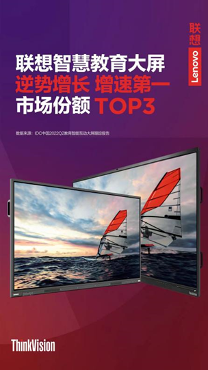 根据8月10日联想集团公布2022/23财年第一季度财报显示,联想集团本财季营收近1120亿元,同比增长0.2%,其中非PC业务营收占总营收的比例达37%以上,超过预期。另外,根据IDC发布2022年Q2《IDC季度教育智能互动大屏跟踪报告》显示,联想智慧教育大屏Q2市场份额位列TOP3,深度说明了联想智慧教育解决方案为教育数字化转型提供了可靠的发展路径。
