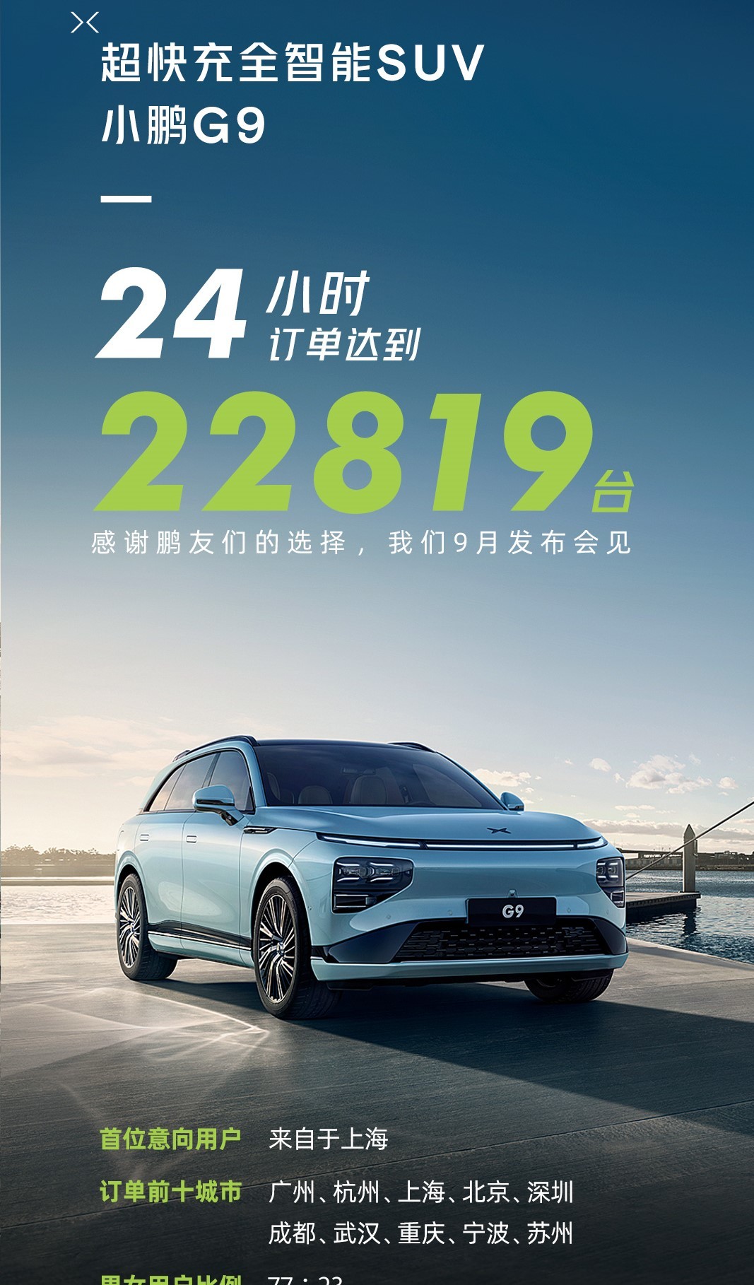 日前,在小鹏G9预定超过24小时后,小鹏发布了一个预定消息,预定24小时订单达到了22819台。根据何小鹏透露,新车或将在9月份上市,且很快会迎来交付。