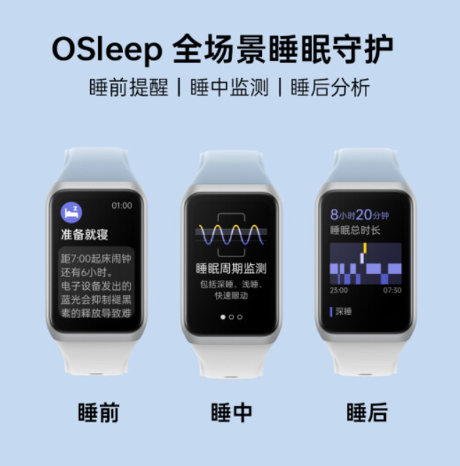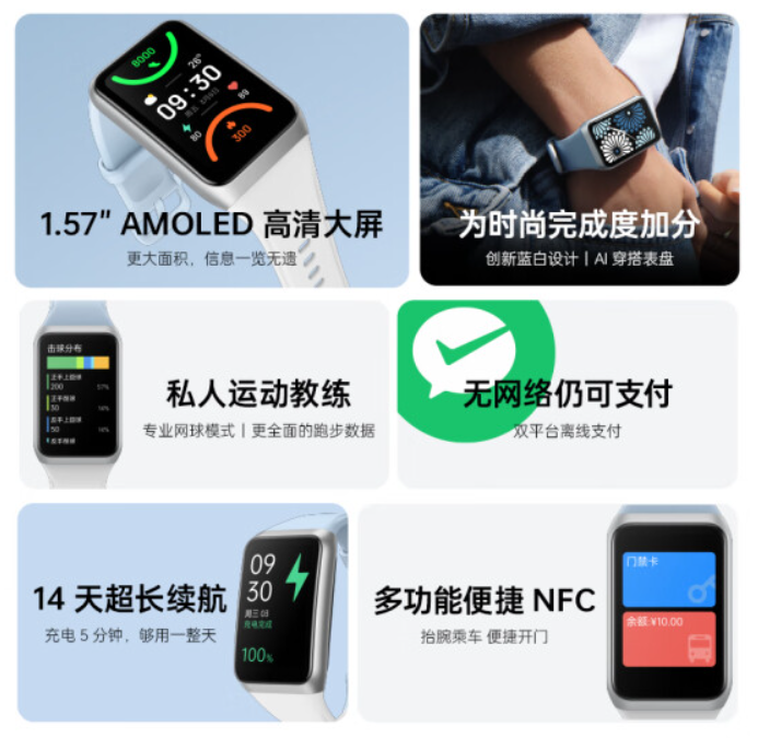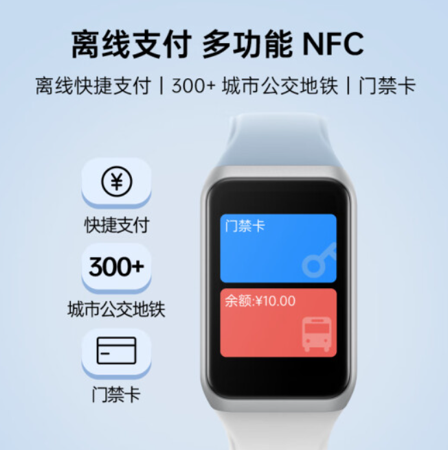 此外,该手环支持离线支付、24 小时不规则心率预警、全场景睡眠守护,拥有 100+ 种运动模式,还有控制音乐、查找手机、闹钟、消息通知、5ATM 防水等,可选多功能 NFC。