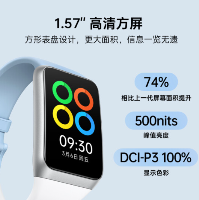 OPPO 手环 2 相比上一代在外形方面有了大幅改进,采用 1.57 英寸 256×402 AMOLED 大屏,302 PPI、500nit 亮度,支持更换近 200 款表盘,配备蓝白撞色表带。手环本体重量 20g,总重量 33g。