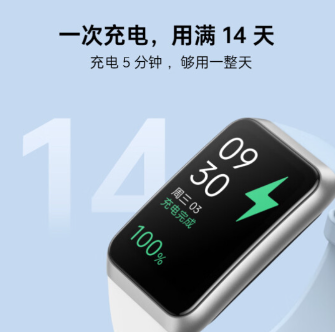 OPPO 手环 2 搭载 Apollo 3.5 处理器,配备 8MB PSRRAM + 128MB Nand 存储,内置 200mAh 电池,支持磁吸式充电,续航 14 天。