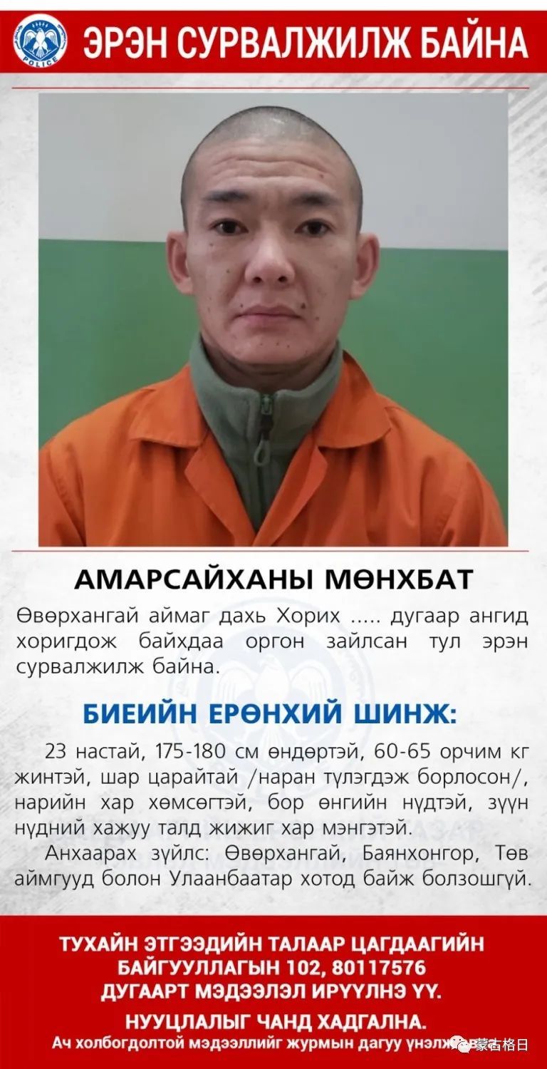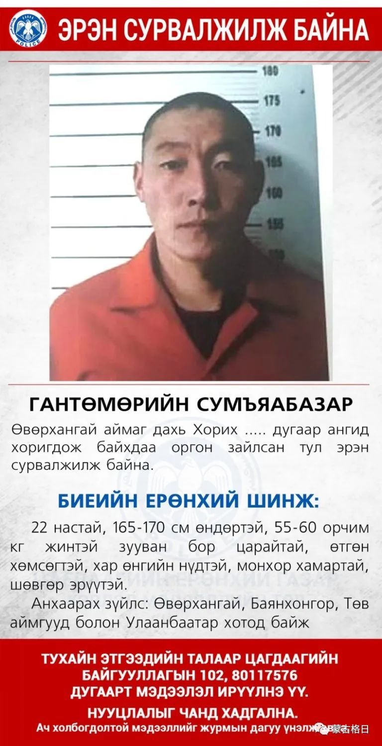 经警方分析判断,上述两名逃犯很有可能往前杭爱、巴彦洪戈尔、中央省和乌兰巴托市等方向逃窜。