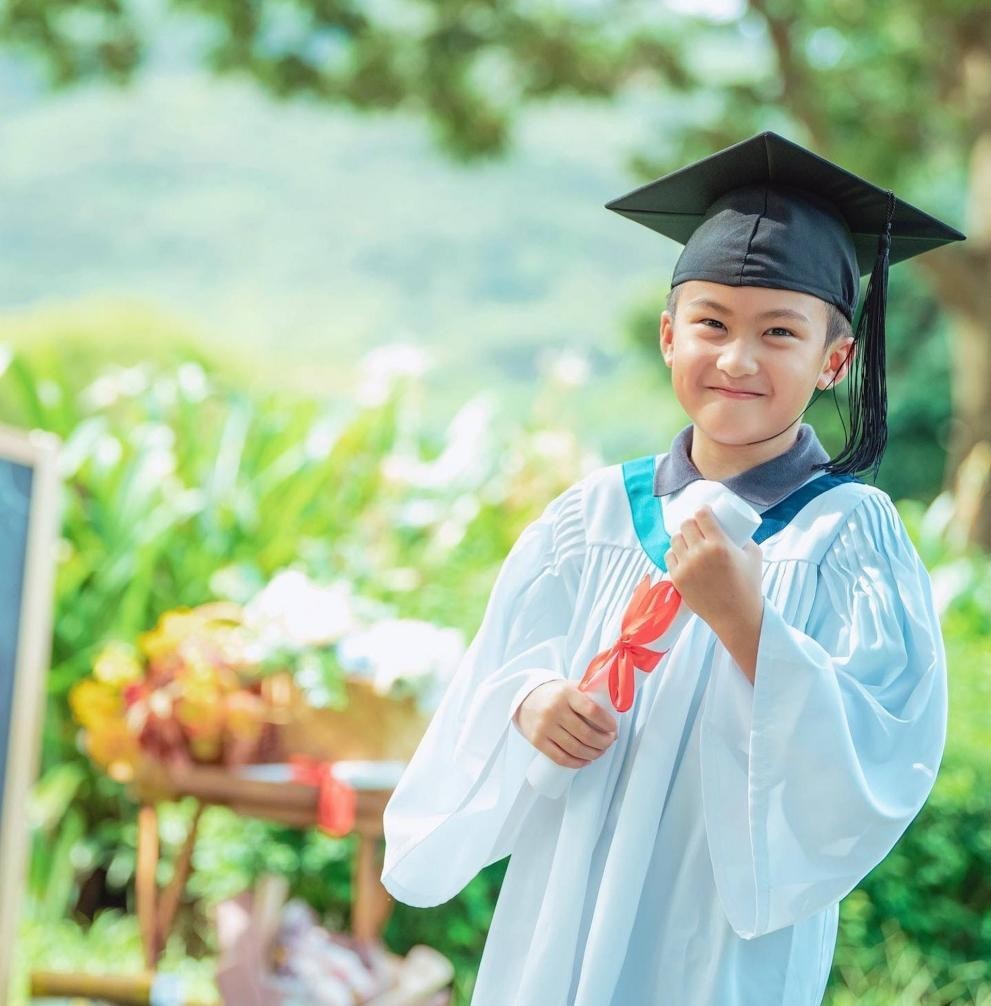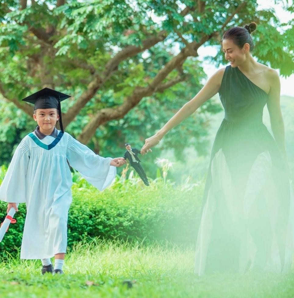 他们还一人一边拉着人偶的手合影,只见陈国坤儿子身穿一件蓝色的学士长袍,头戴学士帽,一手拿着书卷,打扮得很有书卷学霸气息。他面对镜头腼腆一笑,露出一只浅浅的酒窝,十分可爱。而一边的黄依汶则侧头看着牵在自己和儿子中间的玩偶露出幸福的笑容,仿佛一家人都在这张合照中。