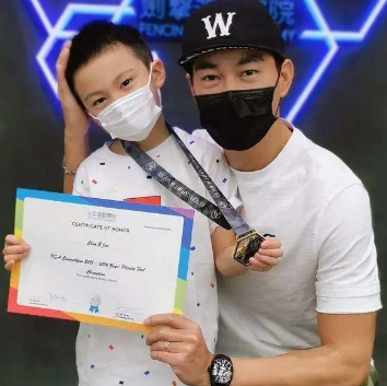 而一旁6岁的儿子穿着校服背着小书包,头发上打了发胶梳了一个帅气的发型。他双手握拳摆出“战斗”的姿势,看起来很有男子汉的气势,五官遗传到了父亲,而眼睛与李小龙也很相似。