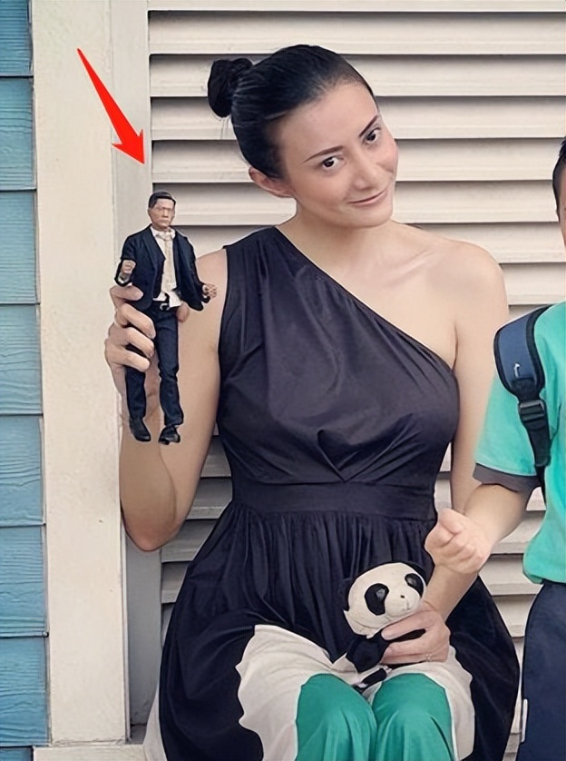 照片中的黄依汶身穿一袭黑色斜肩长裙,露出精致的锁骨和香肩,她简单地挽了一个丸子头,露出光洁的额头和精致大气的五官。她将手里拿着的身穿西装、长得与丈夫陈国坤十分相像的人形模型举起,微微勾起嘴角面对镜头。