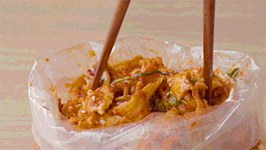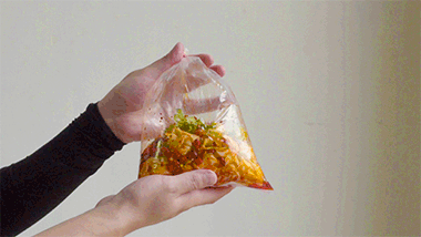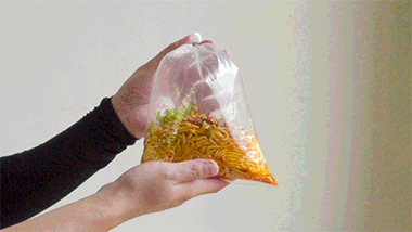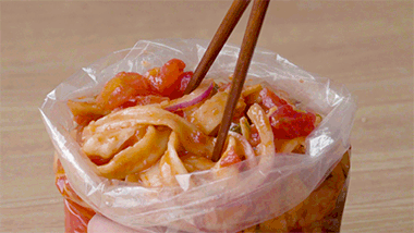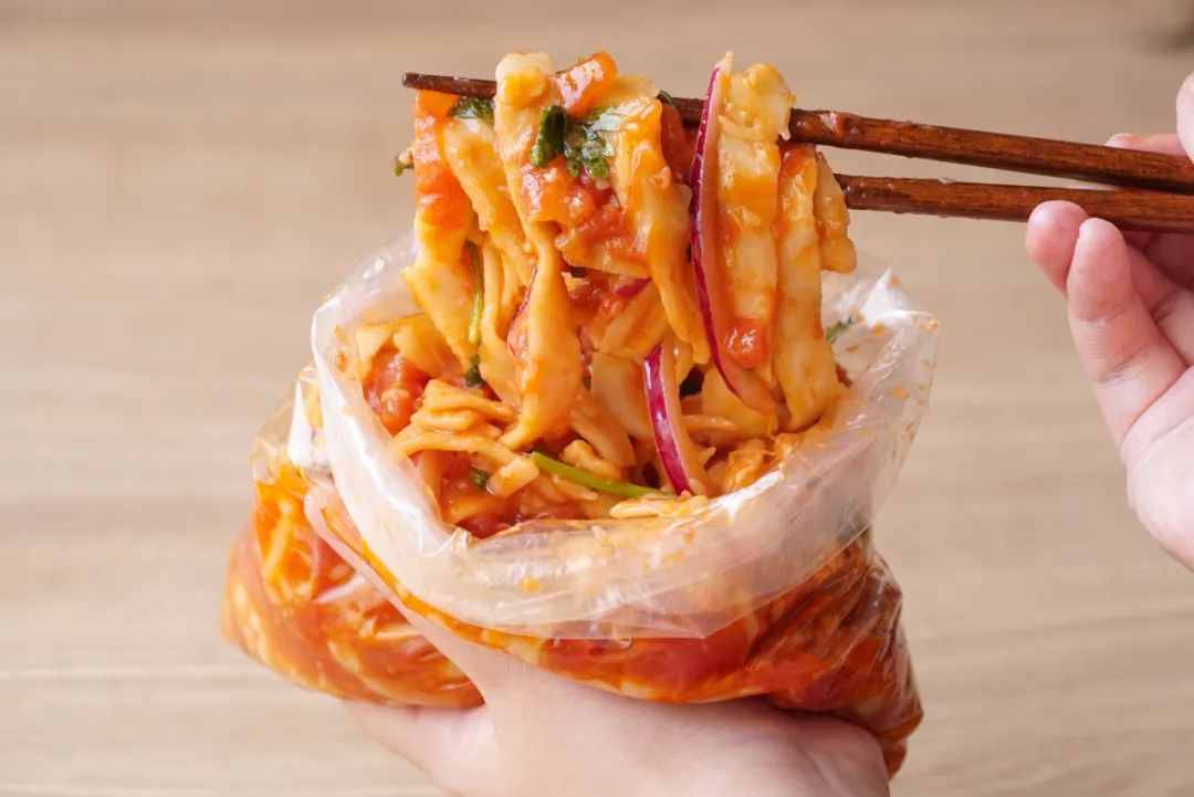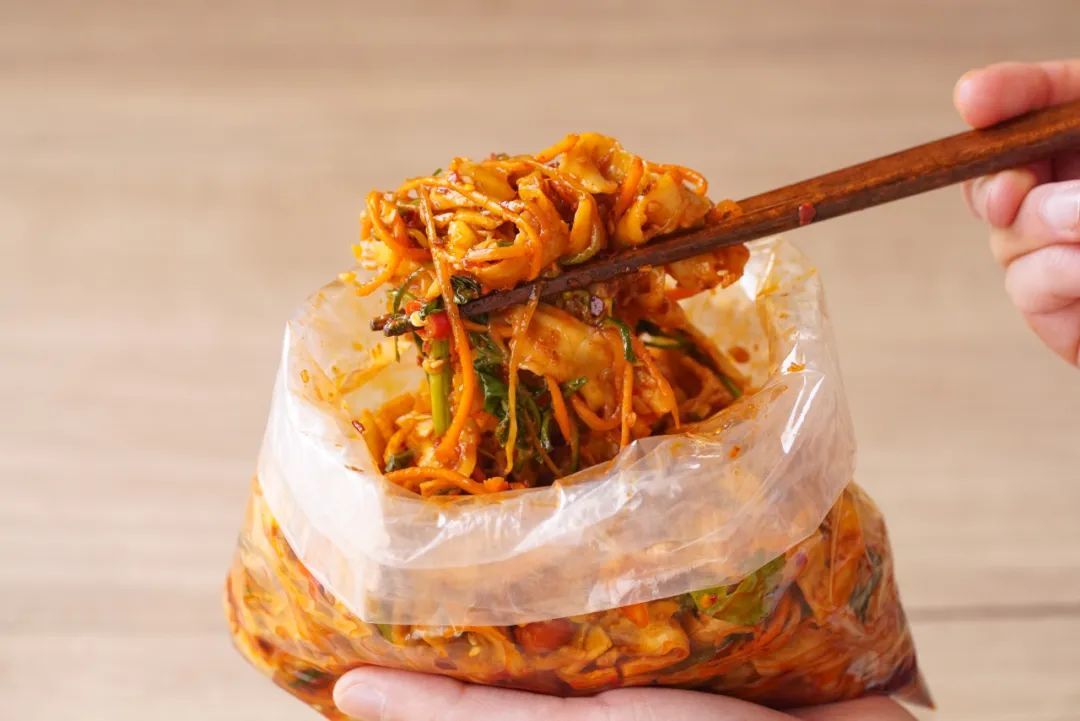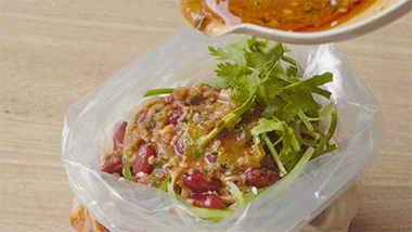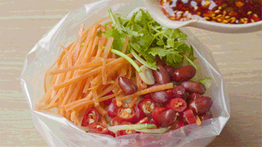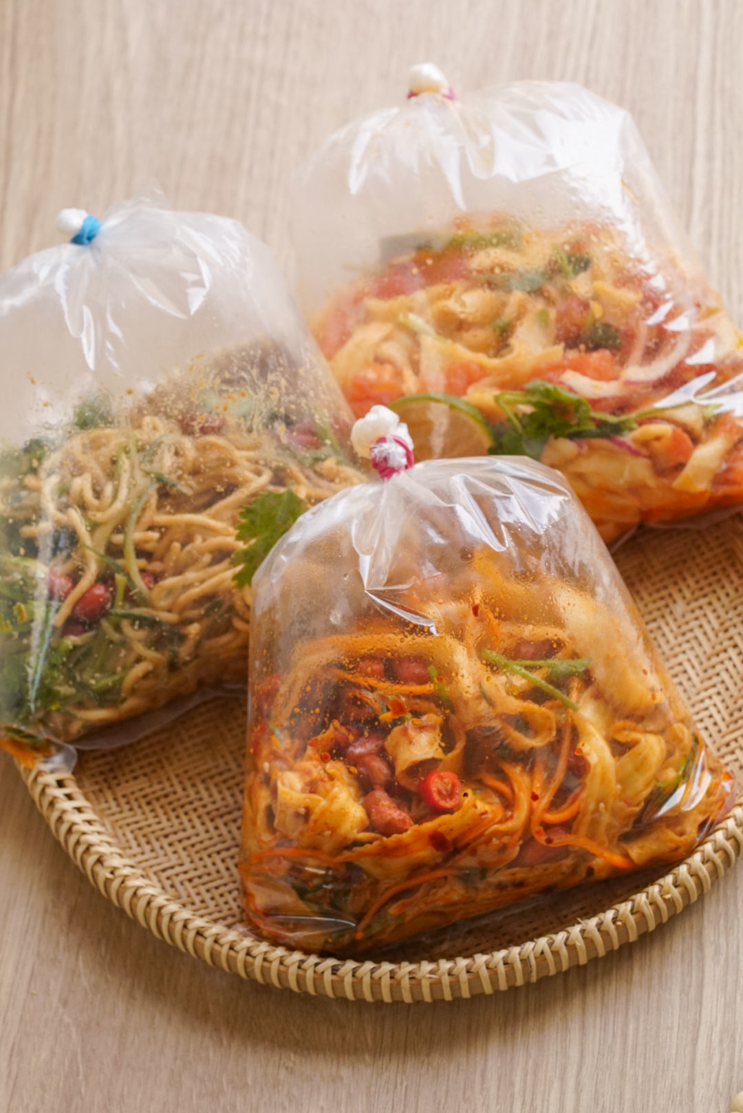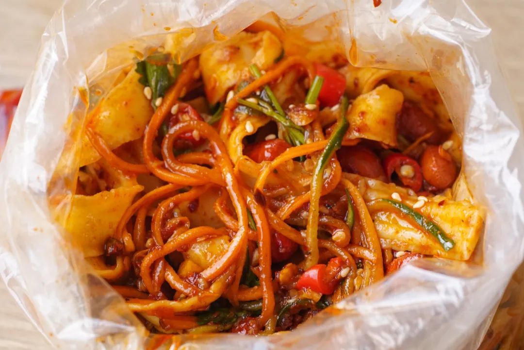 3、透明食品袋中放入刀削面、黄瓜丝、胡萝卜丝、小米椒圈、油炸花生、香菜段,淋上川香料汁。