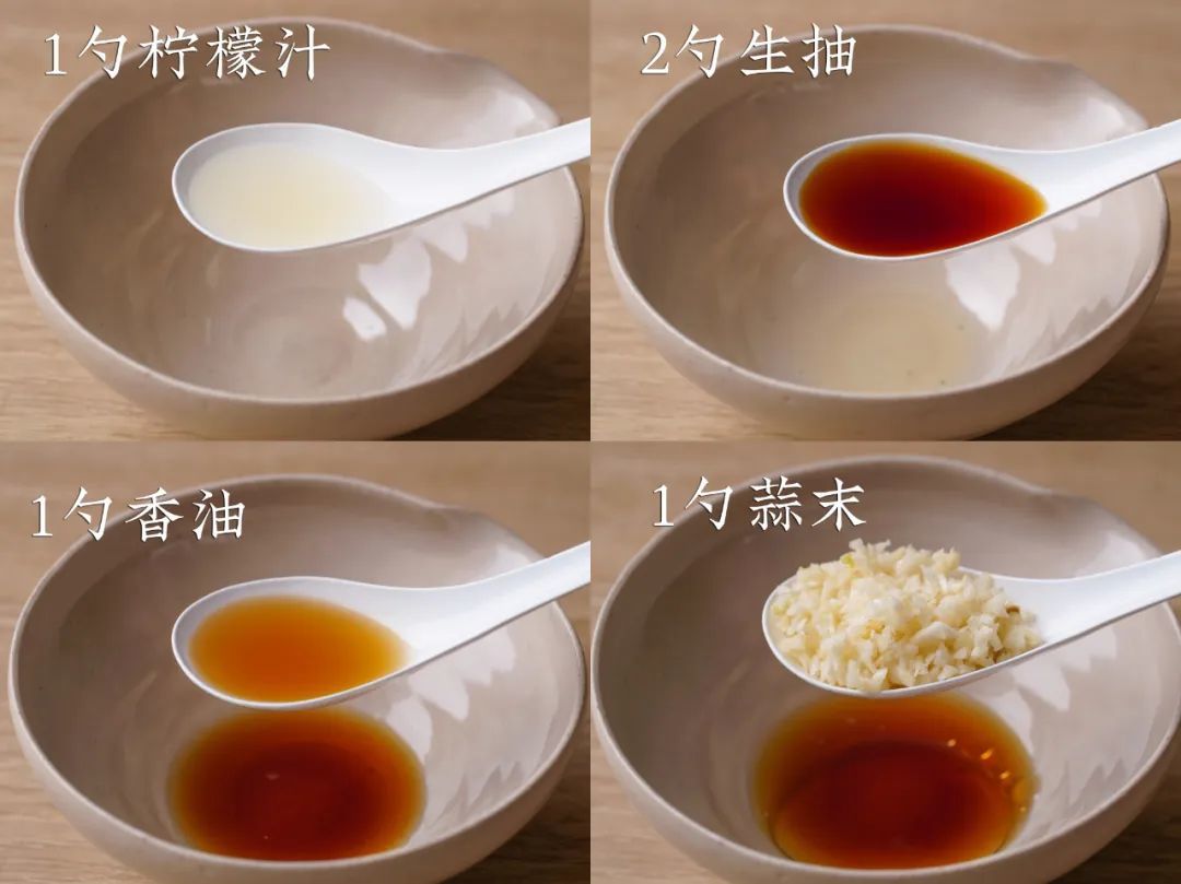 2、料汁:1勺柠檬汁、2勺生抽、1勺香油、1勺蒜末拌匀。