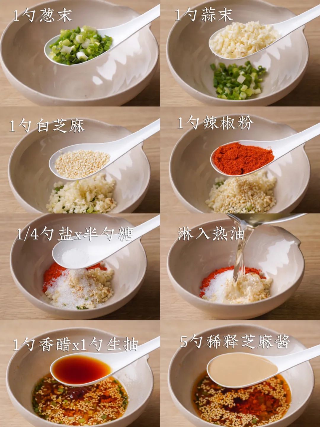 1、麻酱凉面汁:1勺葱末、1勺蒜末、1勺白芝麻、1勺辣椒粉、1/4勺盐、半勺白糖,浇上热油(约5勺量),再倒入1勺香醋、1勺生抽、5勺稀释后的芝麻酱拌匀。