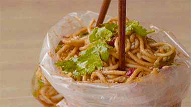 3、透明食品袋中放入细面、黄瓜丝、香菜段、油炸花生,淋上麻酱料汁。
