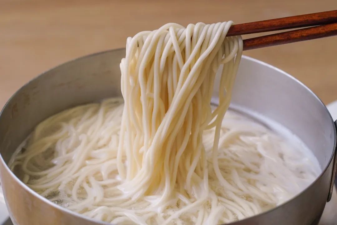 2、此处我用的细面,你也可换成其他凉面:锅中倒入清水,大火煮沸,下入150克细面煮约3-4分钟后捞出,放凉水中备用。