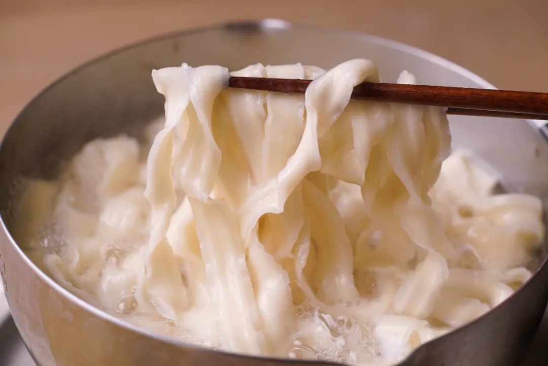 2、小刀削:锅中倒入清水,大火煮沸,下入150克刀削面煮约3-4分钟后捞出,放凉水中备用。