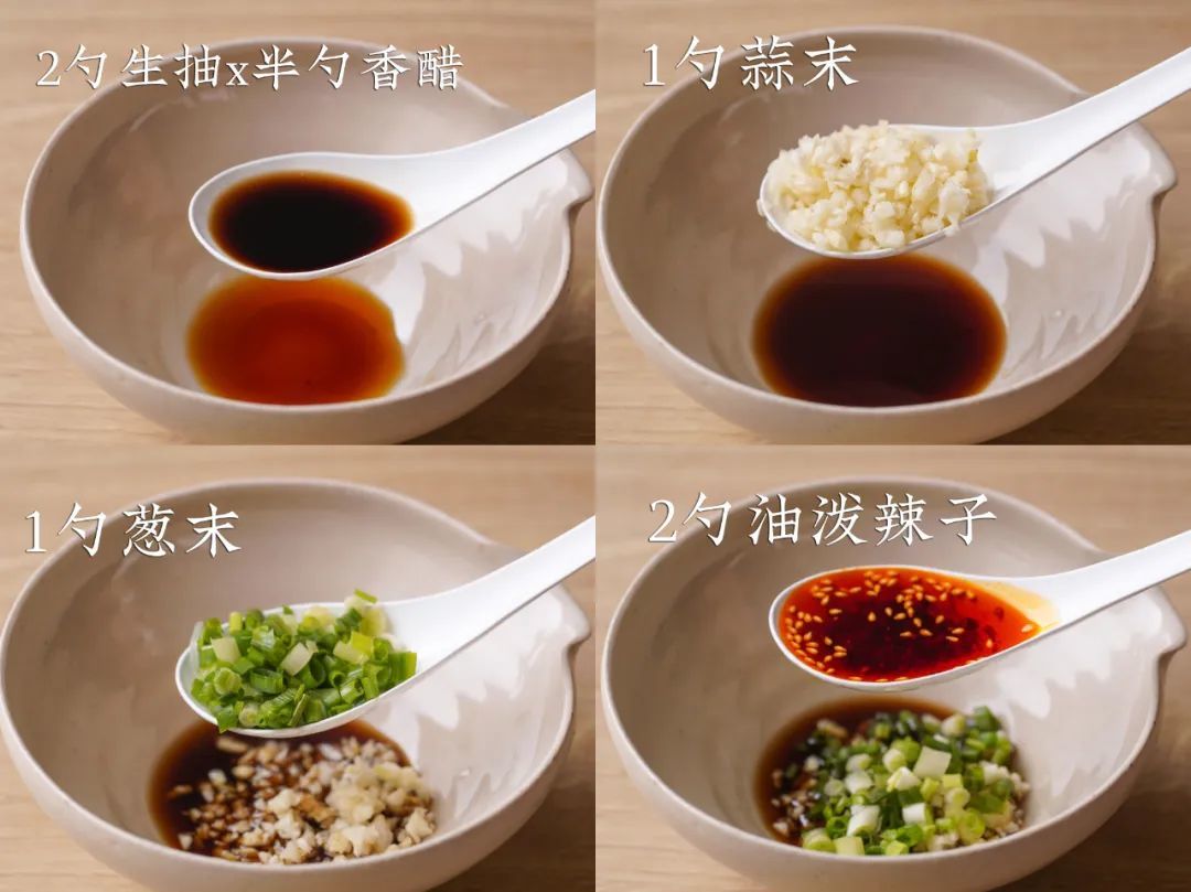 1、川香凉面汁:2勺生抽、半勺香醋、1勺蒜末、1勺葱末、2勺油泼辣子拌匀。