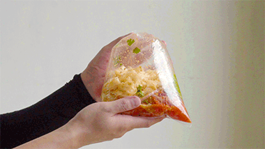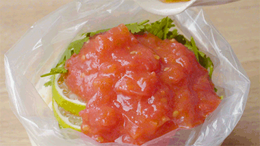 4、透明食品袋中放入刀削面、洋葱丝、香菜段、柠檬片、步骤1的番茄泥,淋上步骤2的料汁。