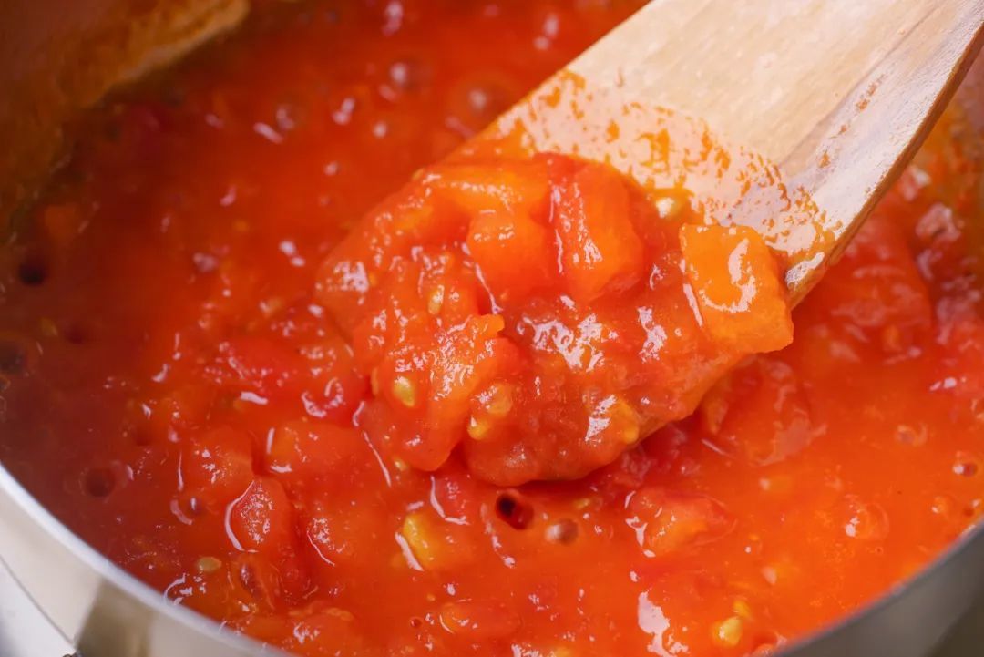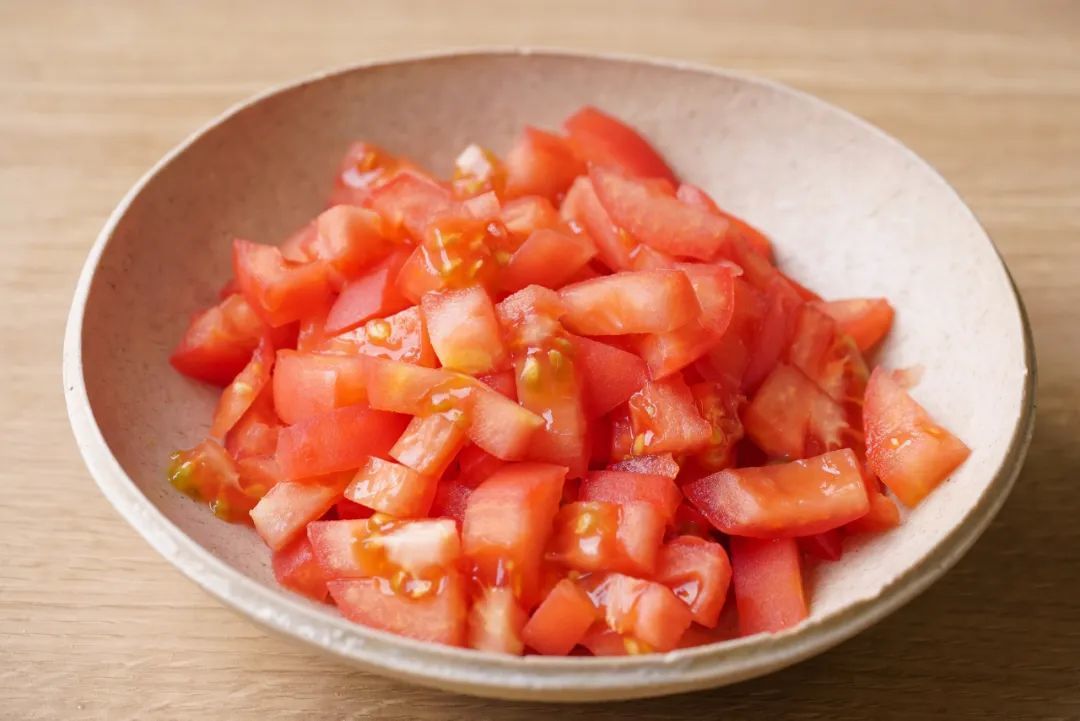 1、将2个番茄去皮切块。锅中倒入2勺食用油,放入番茄块中火翻炒约3分钟出沙,加1/3勺食用盐,最后大火收汁约1分钟至浓稠状态,倒出晾凉备用。