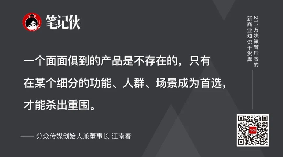 很多人觉得我老是在某个方面比对方做得更好,但如果你是在过剩的地方做得好,消费者是根本不关心的。 一个面面俱到的产品是不存在的,只有在某个细分的功能、人群、场景成为首选,才能杀出重围。