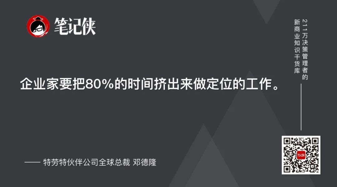 我经常建议,企业家要把80%的时间挤出来做定位的工作,去做哥白尼式的翻转,去跳到企业的外部,去顾客的头脑里回答我是谁的问题。这种职能的转变,通常需要一把手下决心。