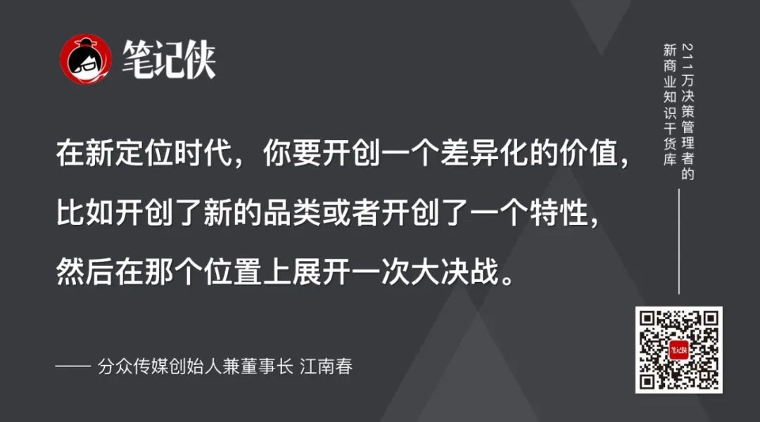 在新定位时代,你要开创一个差异化的价值,比如开创了新的品类或者开创了一个特性,然后在那个位置上展开一次大决战,抓住时间窗口,你在消费者的心中就牢牢地占住了。