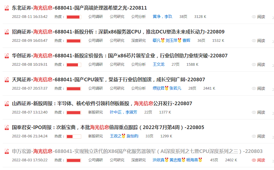 8月12日,今日上市的海光信息竞价高开94%,报70元/股,总市值超1600亿。公司的主营业务是研发、设计和销售应用于服务器、工作站等计算、存储设备中的高端处理器,产品包括海光通用处理器(CPU)和海光协处理器(DCU)。