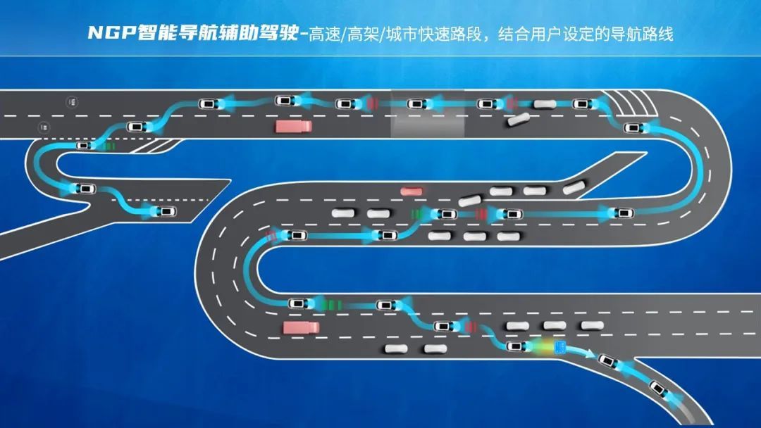 在这里讲解几个功能,比如说 智能变道,策略流畅:汇入高速主路后,NGP会帮用户优先选择快速车道行驶;当途中遇到前车慢行时,系统能在确保安全的前提下,主动变道超车,提高通行效率;在路面良好车道线清晰时,系统会自主纠正行车轨迹,辅助车辆在车道内居中行驶;在驾驶员准备并道转弯时,随着转向灯开启,变道空间充足时,系统将会在确保安全的情况下,自主控制车辆转向完成变道。