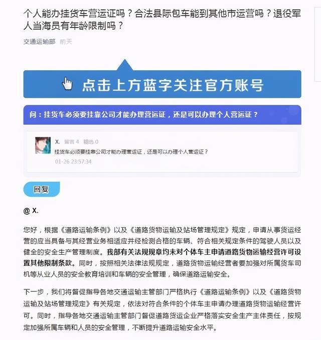 为此,交通部给出了肯定的回复:我部有关法规规章均未对个体车主申请道路货物运输经营许可设置其他限制条款。