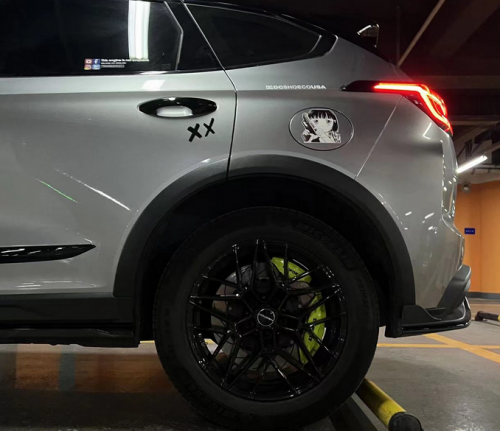 哈弗赤兔自己带的轮毂就是18寸的,于是我改的时候也选了同样尺寸的迈斯顿轮毂,试了好几款颜色之后,发现黑色款和我的灰色车身最配,配上大佬们推荐的米其林PRIMACY 4ST 皓悦,驾感和降噪静音的效果一下就飞升了。