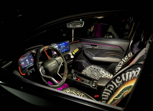 改车嘛,要么就不改,要改就得内外兼修,不然光外面看着拉风,坐进车里什么科技感潮流感都没有,那不瞬间拉胯了。不过这话多少有点大言不惭,毕竟哈弗赤兔本身的内饰就是属于那种未来科技风,空间很大,但整个布局比较紧凑,多少有点战斗座舱的意思。