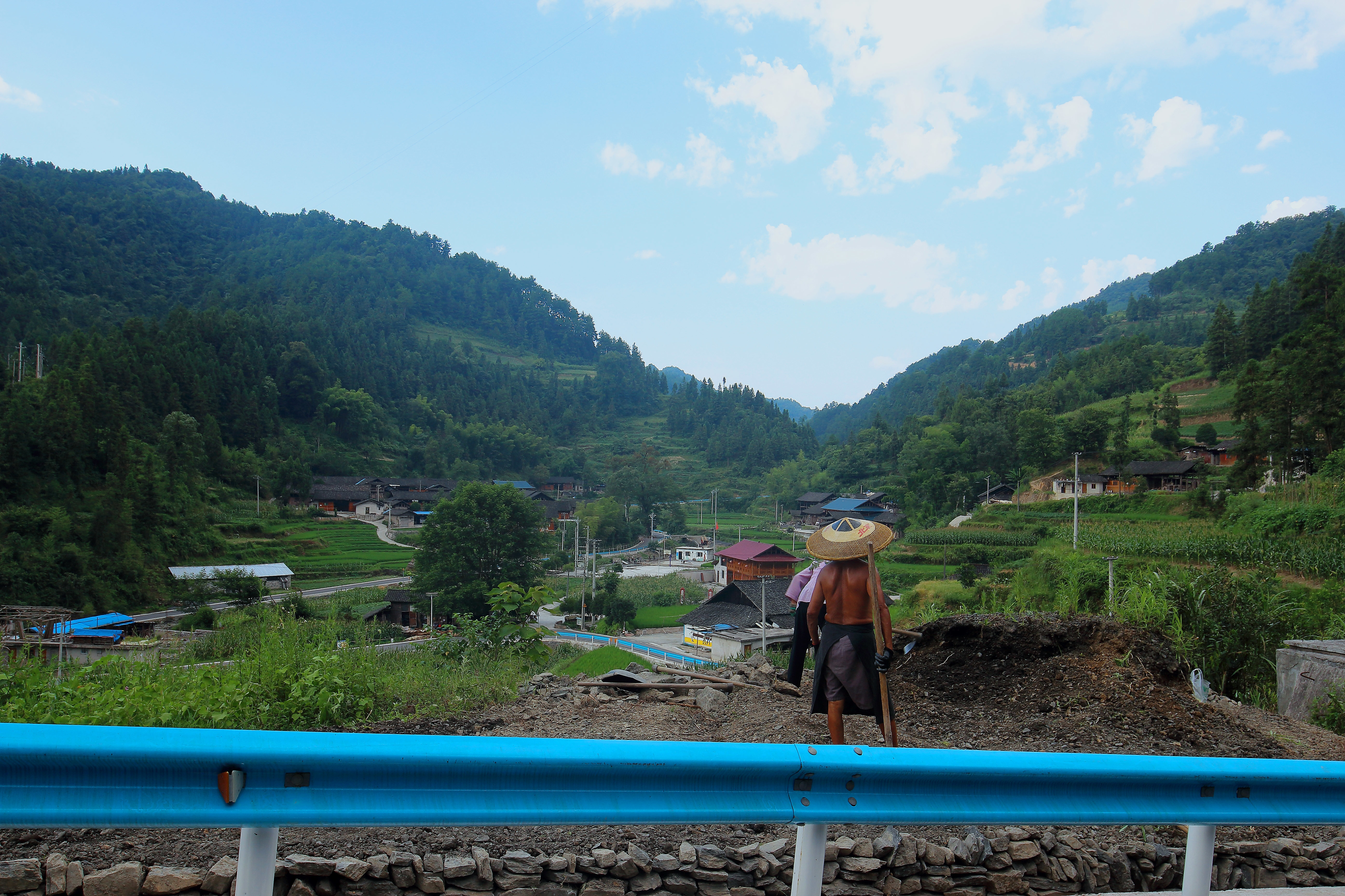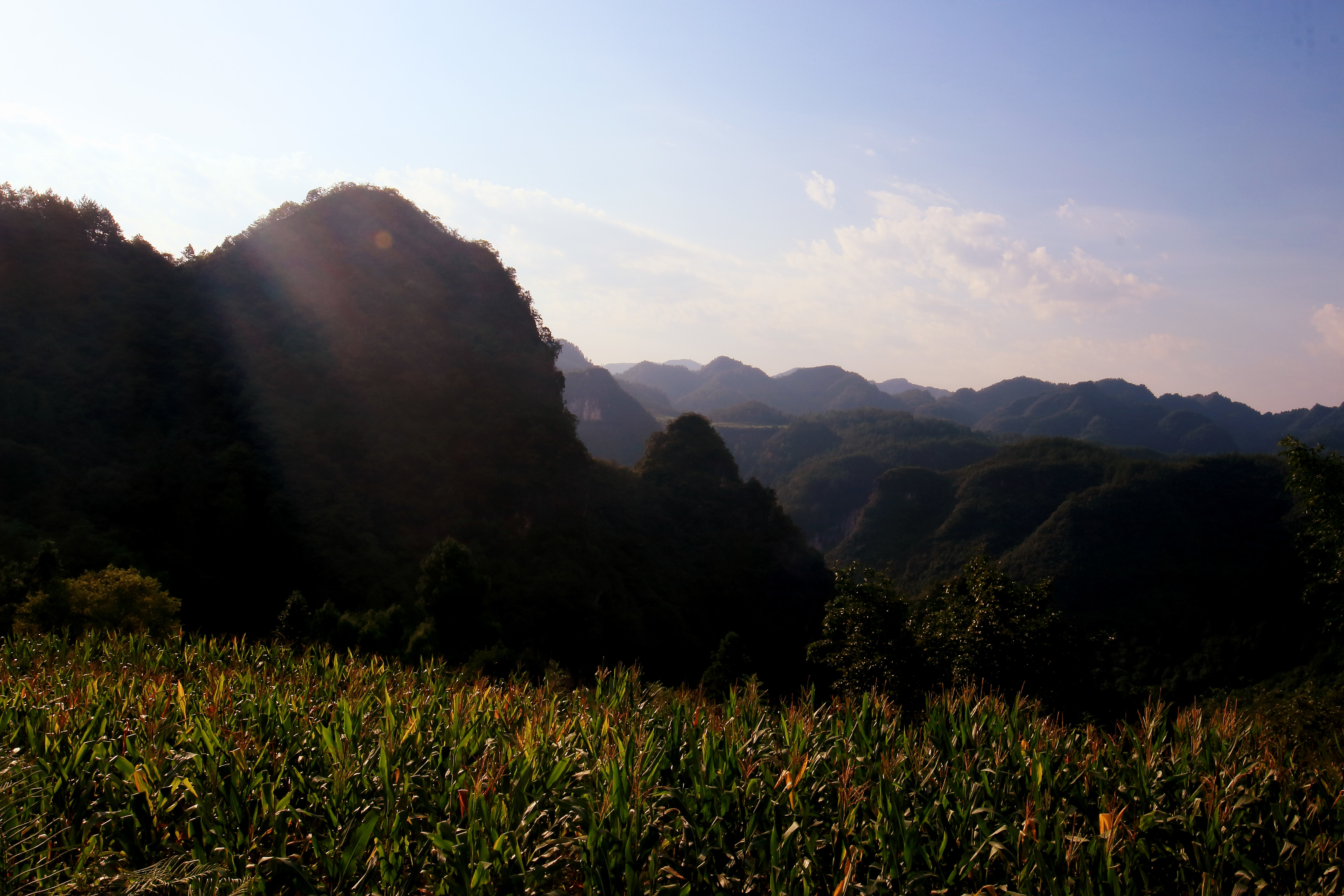 翻过山坳,开始盘行于峰回路转之间,峰峦在阳光中摇晃,山间空隙田里种的玉米,朝气蓬勃,散发着青春、飒爽英姿的中国乡土气息。