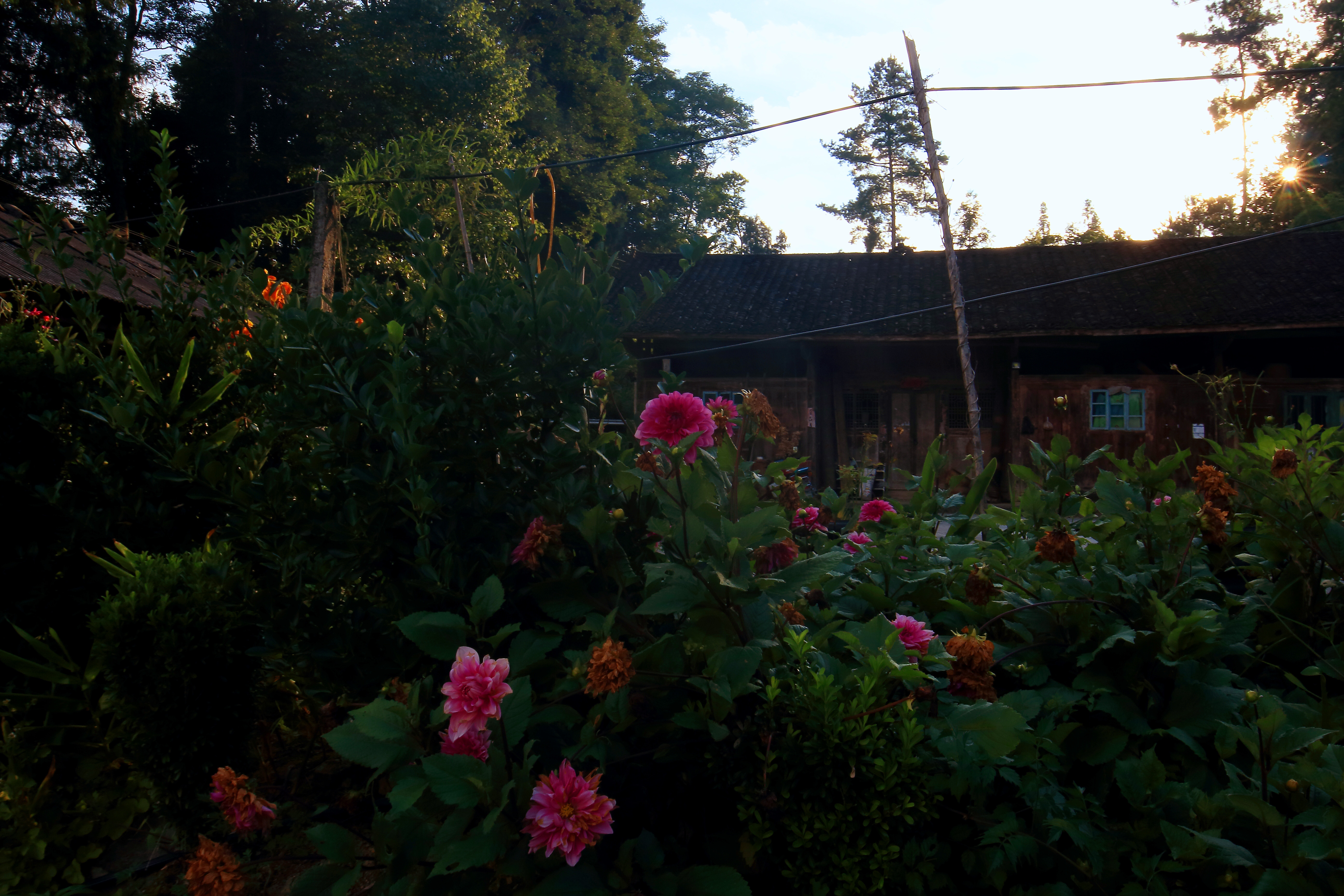 路过一栋乡村人家的民宅小院,院前路旁娇羞的芍药花、翠竹,门前的松树、菜园,灰瓦、纯木结构的房子,这不就是我们要寻找古村的缩影。