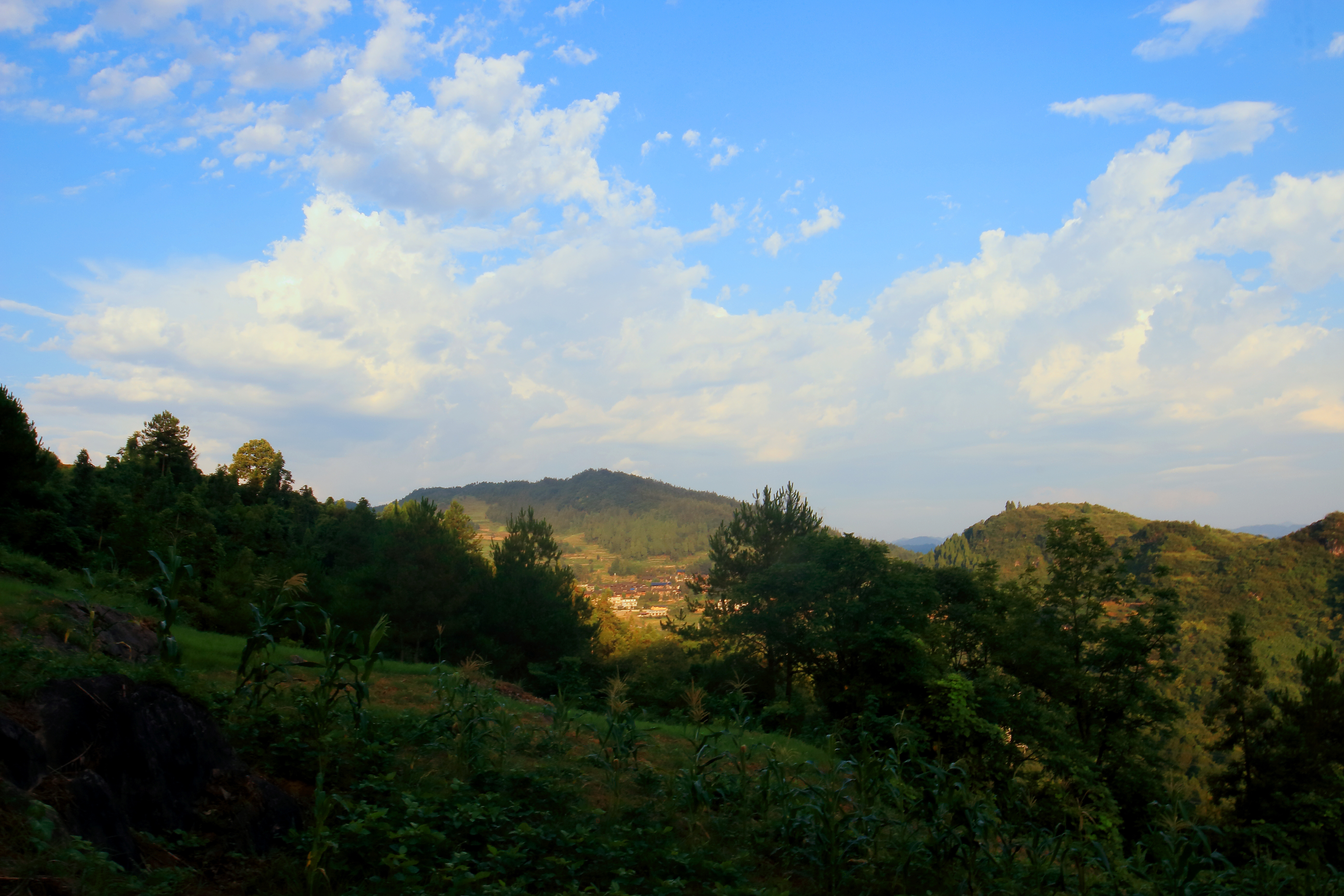 登山半小时,回看四周风光是如此厚实的色彩,蔚蓝的天空、繁盛的夏季的绿色,剥去彩色外衣、飘荡不定的白云,远山在霞光中闪动。