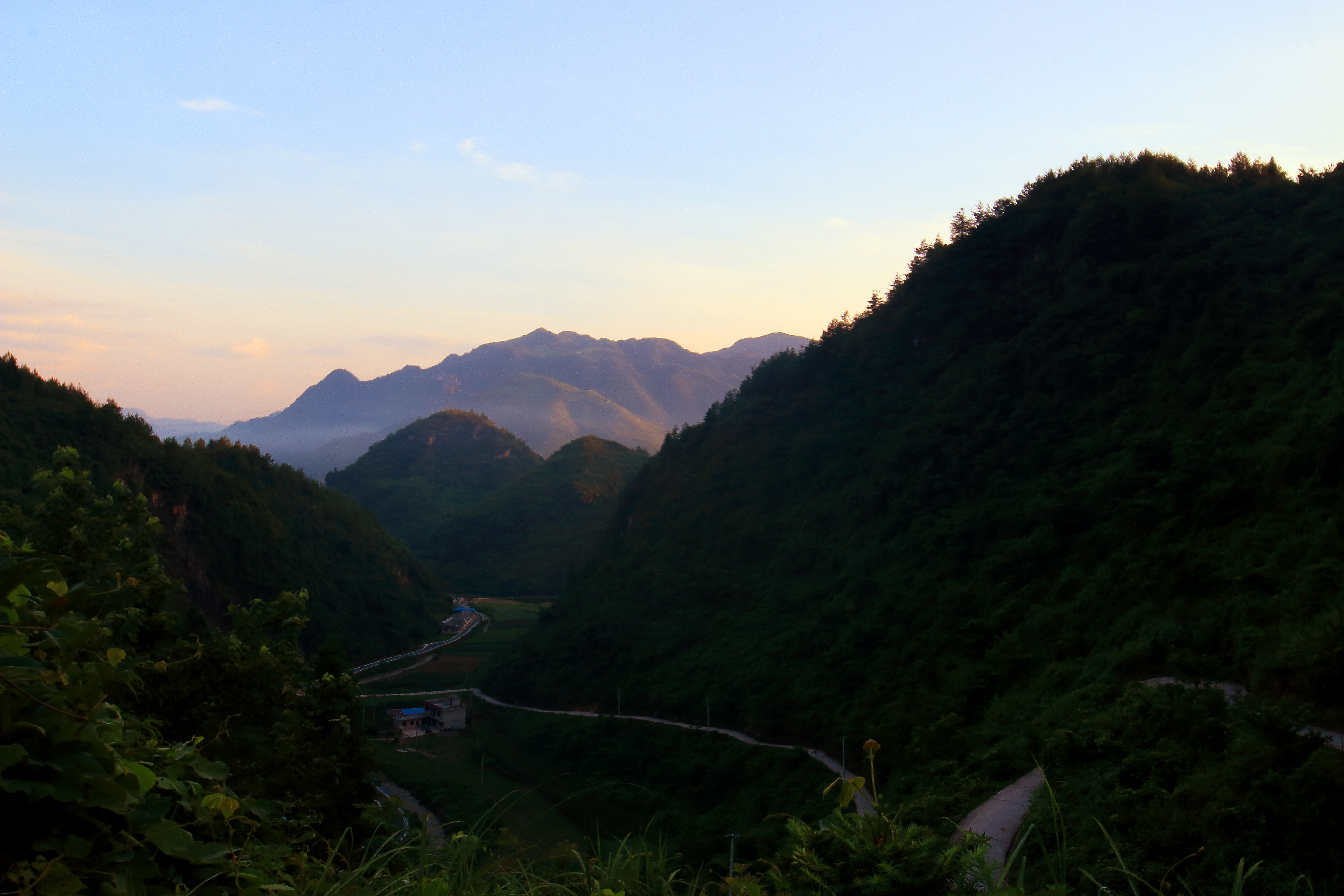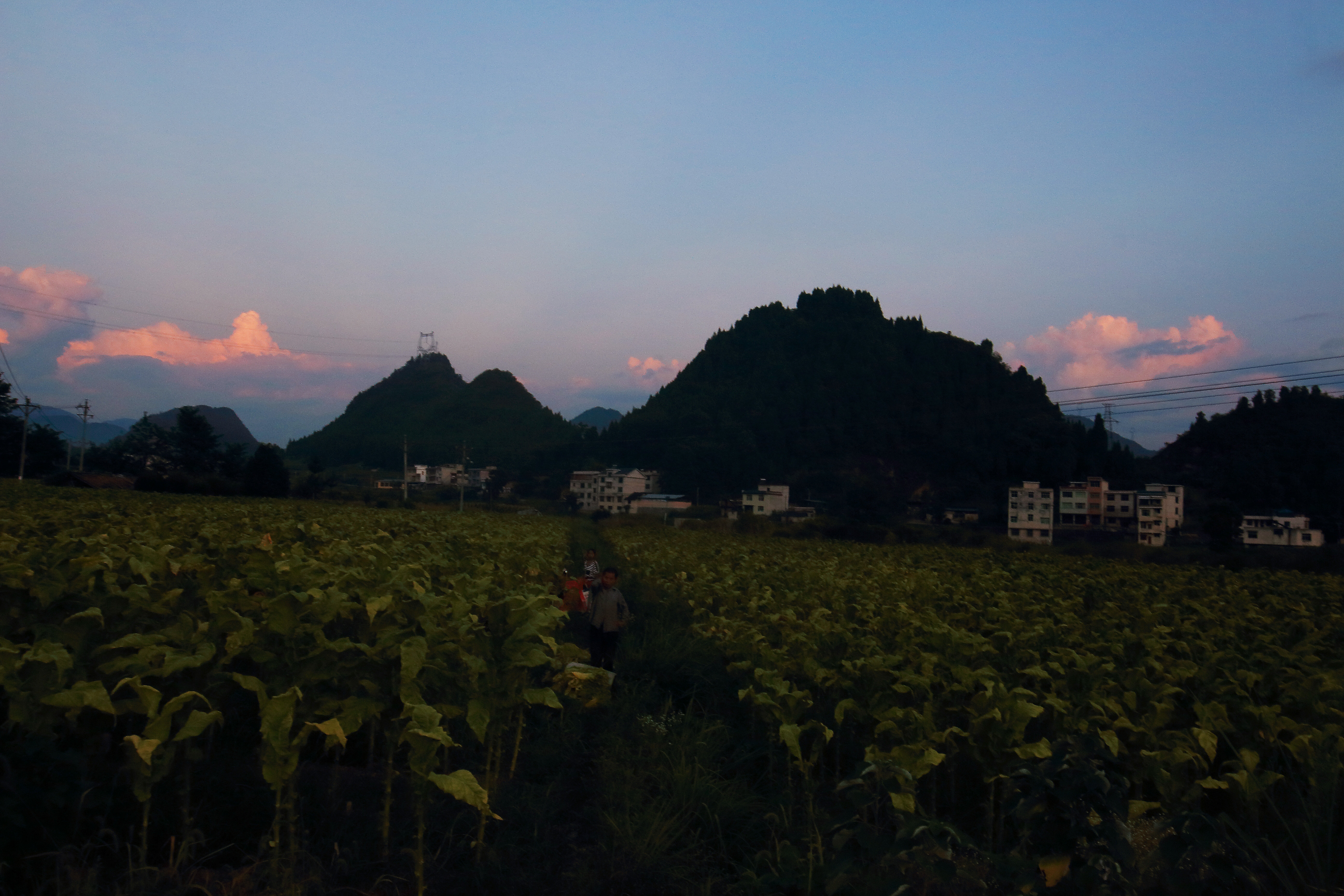 第二天早上六点从闵孝镇出发,路过农田,已见乡亲们准备下田采烟叶。早霞染红了山边白去,江口县地于高原向丘陵过渡的地带,地理环境即有喀斯特地貌丘陵、石山,也有巍然屹立大山,茶叶山村处在不大、也不小的山腰中。
