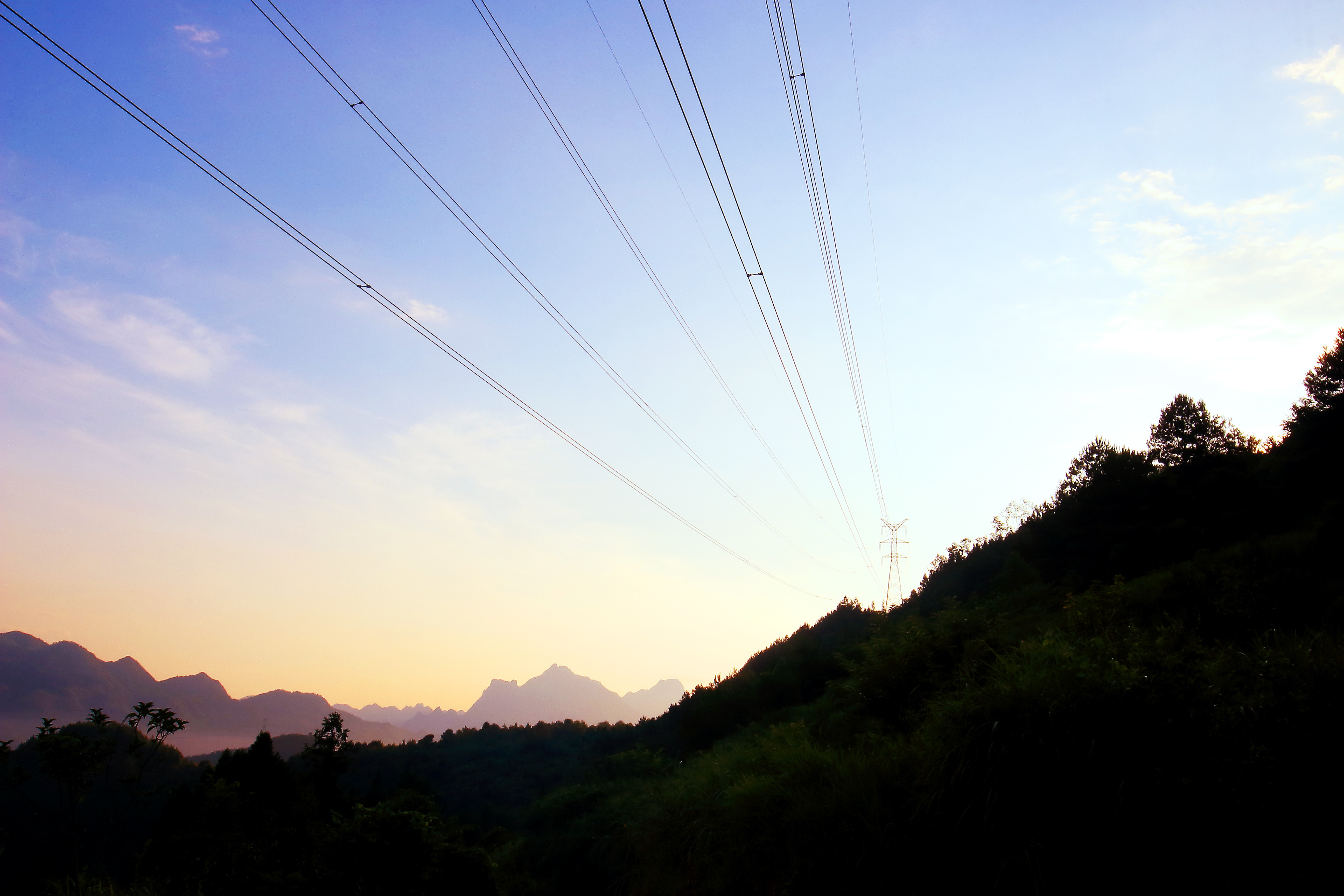 电线高塔边接着万家灯火,纤细的电线如神经样,串联着工业文明的大脑,与前方自然险峰-梵净山景区相连,电线高塔就显见柔弱。