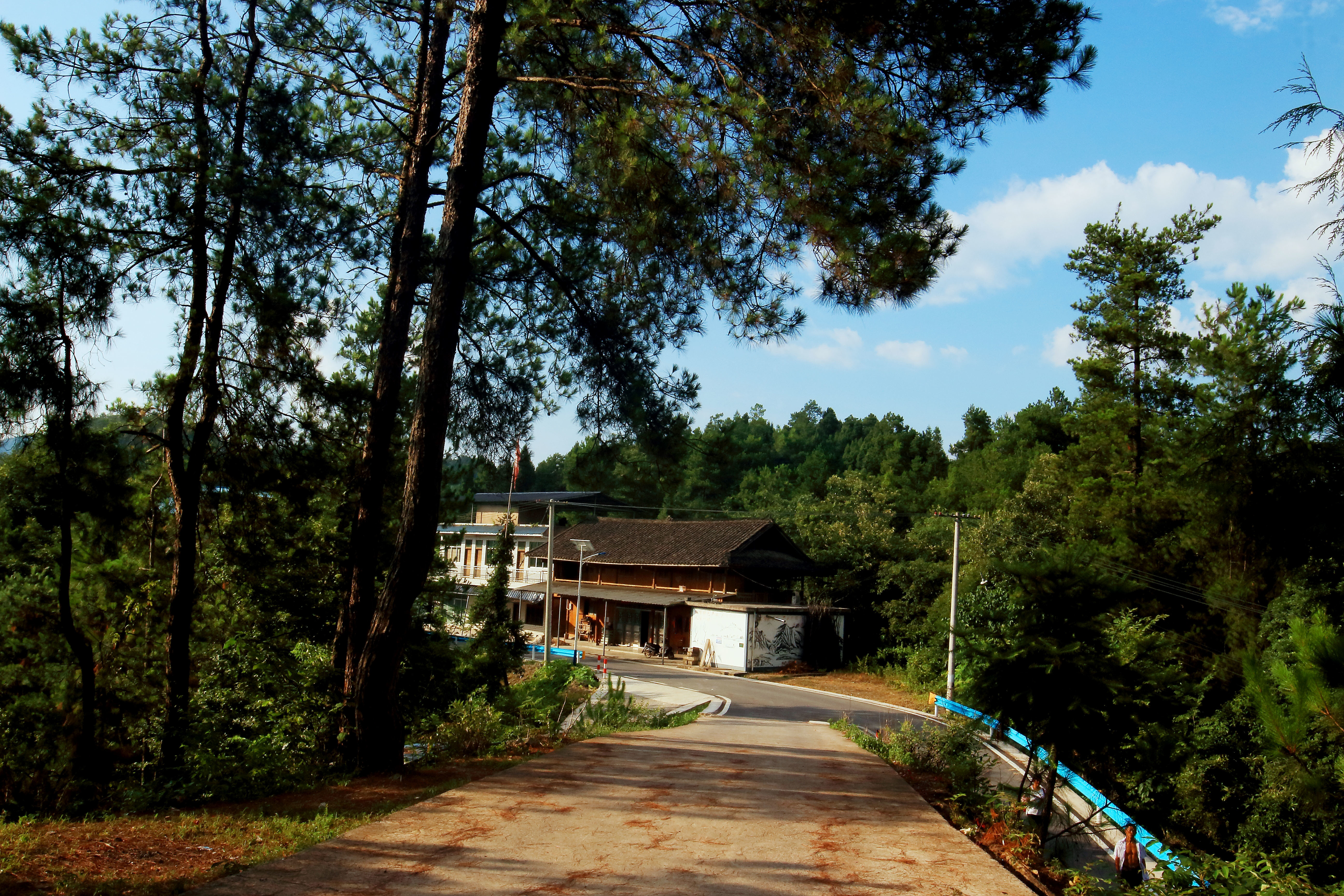 与新修柏油路汇聚,黑白相间,青松落下橙色的松针,新旧乡村的民宅对比,蓝天白云,鲜活的色调。炎热夏天山下气温36度,而这里凉风习习,路边还有乡村们晒薄棉被。