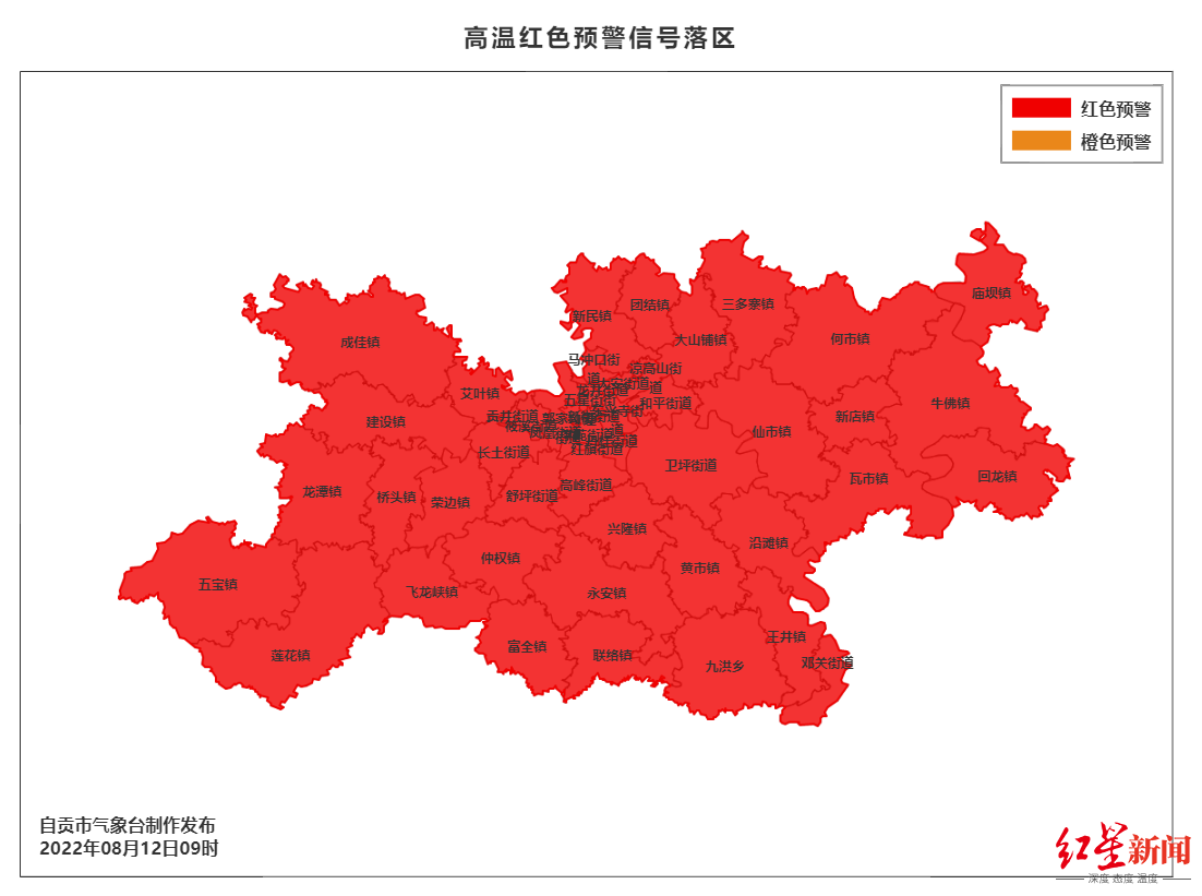 8月11日9时0分,四川自贡市气象台将2022年8月7日9时0分发布的高温橙色预警信号更新为高温红色预警信号:预计今天白天,自贡市贡井区、自流井区、大安区、沿滩区各乡镇(街道)最高气温将升至40℃以上。