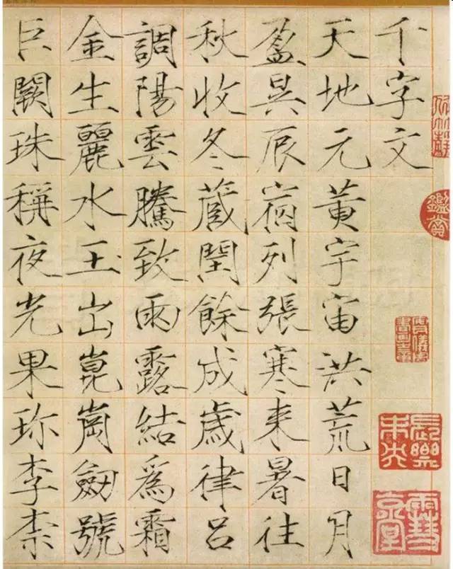 此件《真书千字文》,文体匀称,用笔轻按重收,顿折利落,具有飘逸清润之感,显示出"瘦金书"的独特风格。——上海博物馆评注