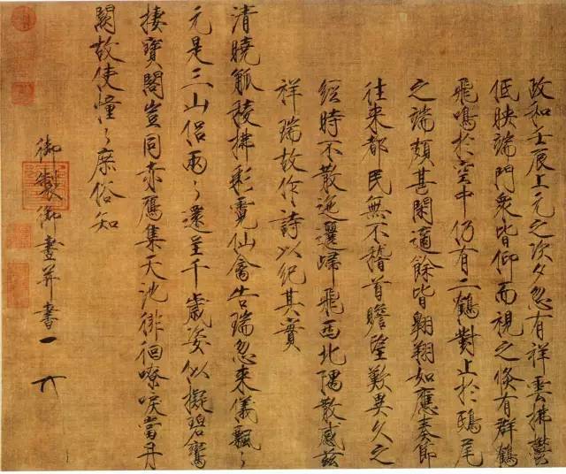▲宋徽宗《瑞鹤图》,绢本,卷,楷书,后期风格,辽宁省博物馆藏。